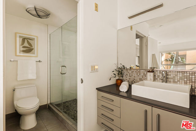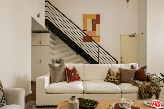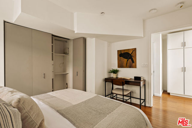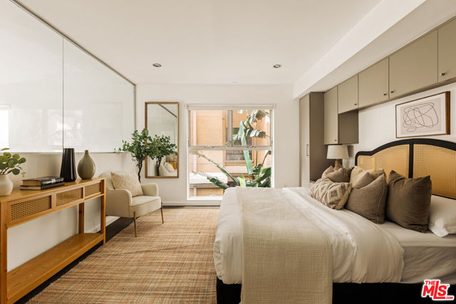 Residing in one of Los Angeles' most centrally located neighborhoods, this creative architectural loft is accentuated by an open-concept, contemporary design. Nestled in a prime back corner spot in the building - away from the street and high above ground level - this residence delivers as a serene, private, and secure retreat. Bamboo hardwood floors, soaring ceilings, and oversized windows create a juxtaposition of warmth against exposed industrial ducting. Anchoring the living area, the well-appointed kitchen and dining space flow seamlessly out to an oversized balcony, perfect for entertaining. Upstairs, a large mezzanine-style bedroom features windows overlooking the main level, offering a sense of openness while maintaining separation. On the main level, a second bedroom provides the ideal space for a home office, creative studio, or additional sleeping quarters. With two modern bathrooms, ample storage, and an in-unit washer and dryer, this space offers both form and function. Beyond the unit, enjoy sweeping views from the shared rooftop terrace - a hidden gem ideal for lounging, entertaining, or watching the city come to life. Parking is never an issue with two assigned garage spots in addition to multiple guest spaces. All of this, just moments from some of the most iconic restaurants, theaters, nightlife, and studios.