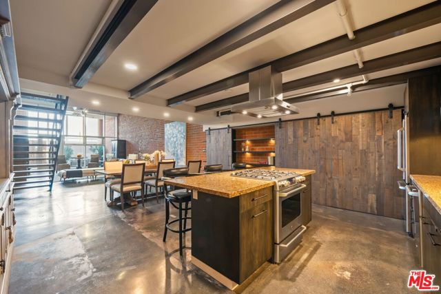 Welcome to Gallery Lofts, a live work community located in the heart of Arts District. This private oversized loft creates the perfect creative sanctuary for artists, musicians, and other like minded individuals. The expansive living area features soaring 16 foot ceilings, polished concrete flooring, an exposed brick wall, and 200 sf private patio that is not included in the total interior square footage. A rare amenity that offers so many possibilities. Also on the first floor is a spa-like full bath and gourmet kitchen with granite countertops, stainless steel appliances, and plenty of built in storage space. Walk up the floating staircase to the primary with bright en-suite bath, and an an option for extra privacy provided by the sliding barn doors. Before entering the primary there is ample space on the mezzanine for a home office or exercise area overlooking your spacious lower level. Experience all of Arts District's bustling galleries, restaurants, and nightlife. Community features gated security entrances, outdoor atrium, fountains, and a secure mailroom. One assigned parking space with convenient and direct access to the private patio entrance. HOA dues include high speed internet, water, gas, trash, sewer, and community security system.