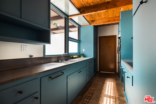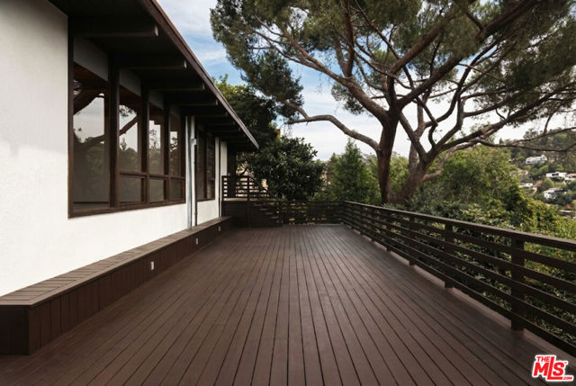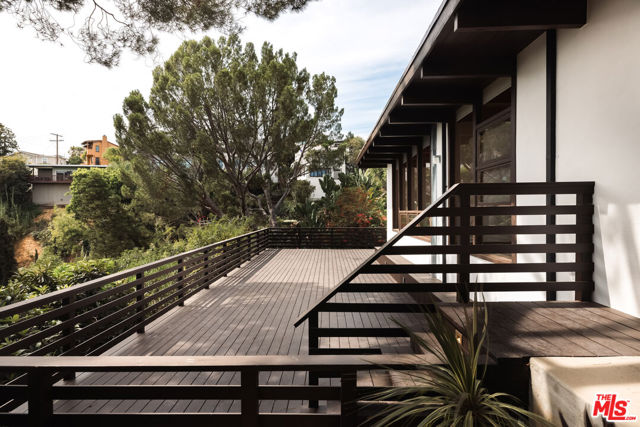 Thoughtfully renovated with attention to wood, light, and proportion, the home balances its original character with modern conveniences and a quiet, contemporary simplicity. A moment of stillness greets you at the entry, where the original fireplace creates a soft pause before city and hillside views open across the living spaces. Restored Pella windows throughout the home frame treetops and shifting sky, giving the interiors a gentle, treehouse like quality. The living room extends seamlessly to a wraparound redwood deck, a place where mornings feel bright and unhurried and evenings settle effortlessly into color. The kitchen blends midcentury roots with considered updates, preserving the original tile while introducing custom cabinetry painted in a lovely Farrow and Ball blue. Miele and Fisher Paykel appliances bring modern ease, integrated in a way that supports rather than distracts from the home's architectural clarity. In the primary suite bathroom, olive green Heath tile introduces a natural, grounded tone, complemented by an electrically operable skylight that welcomes natural light and fresh air. A second full bathroom along the hallway retains its original wood vanity with a marble countertop and a classic shower, a thoughtful nod to the home's enduring midcentury character. The three bedrooms located off the central hallway create a natural separation between the social spaces and the sleeping quarters. All are quiet, grounded rooms with leafy views and soft natural light. The surrounding landscape feels intimate and tucked away, with mature plantings, winding pathways and a cedar soaking tub that turns the garden into a restorative extension of the home. All major systems have been updated, including the roof, electrical, plumbing and an entirely new HVAC system, creating a move-in ready experience with nothing left to do but settle in. A spacious two car garage offers additional storage, workshop potential or a future studio conversion, adding flexibility to the property. Life here is deeply connected to the neighborhood. The home sits within easy reach of beloved Franklin Hills and Los Feliz staples such as Little Dom's, All Time, Maru Coffee, Alcove, Figaro, Barbrix, Kismet, and Loupiotte. Griffith Park, the stair streets, and local markets add to the sense of convenient accessible. A 1957 midcentury home renewed with restraint and care, offering a peaceful perch in one of the most cherished neighborhoods.