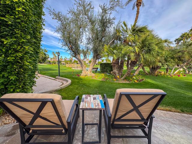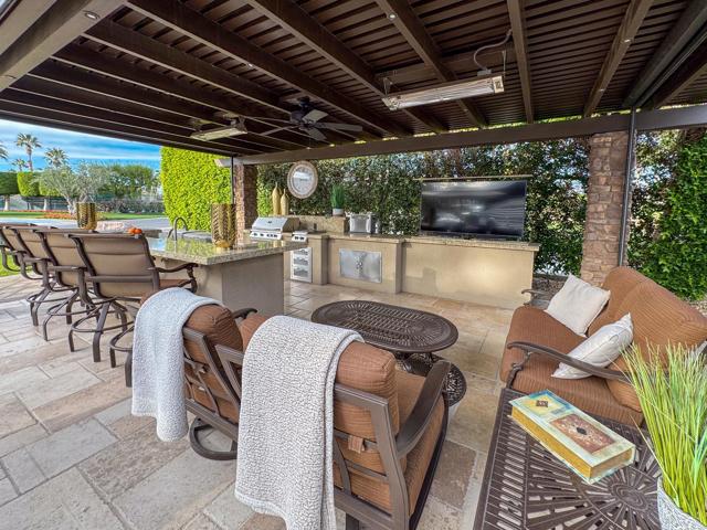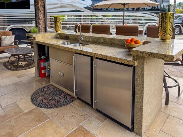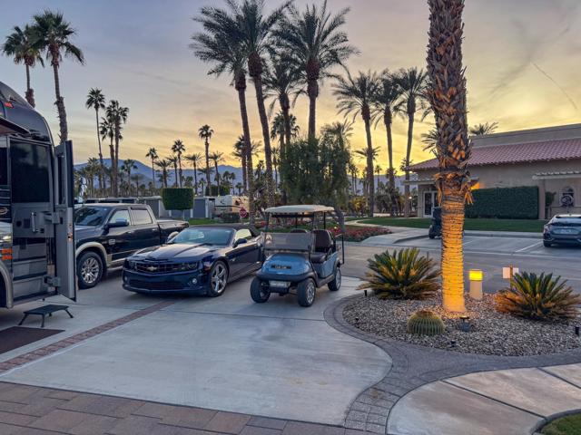 Outdoor Resort Indio is a Class A Motorcoach resort. This is an RV lot. This exceptional, oversized pie-shaped lot is one of the largest golf course properties in the resort. Perfectly situated behind the 6th tee box. The lot's extra-wide frontage provides abundant parking for multiple vehicles, with the opportunity to expand further. Conveniently located directly across from the clubhouse, main pool, and pickleball courts, you'll enjoy unparalleled access to the resort's top amenities. As the sun sets, the beautifully lit landscape creates an inviting ambiance, making this lot an entertainer's dream for hosting friends and neighbors.Designed for luxurious outdoor living, the lot features a beautifully upgraded kitchen with stainless steel appliances, granite countertops, a BBQ, large ice maker, refrigerator, double sinks, and a pop-up TV for entertaining. The spacious pergola with tiled flooring offers comfort and shade with electric drop-down screens on three sides, under-counter lighting, a ceiling fan, and two outdoor heaters for comfort. Thoughtful landscaping and paver accents create a welcoming and pet-friendly environment. With ample living space and the potential for a large casita, this lot provides the perfect blend of luxury, convenience, and privacy for the discerning RV owner. Plumbed and wired for a dishwasher.