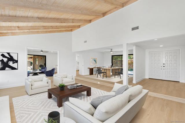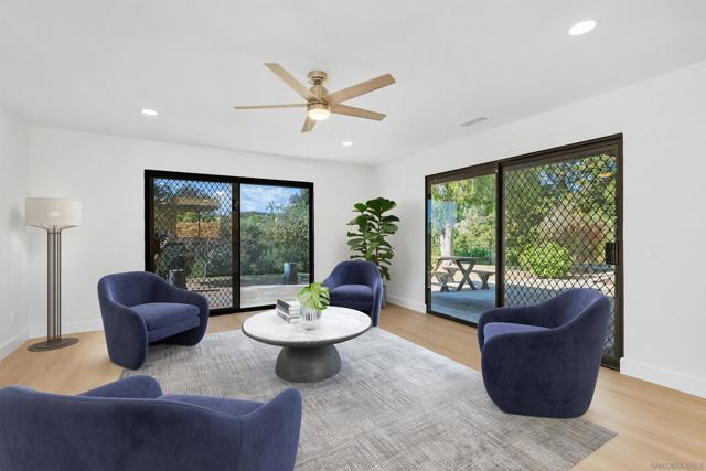 Stunning single-story home set on a breathtaking 2.36-acre lot. This beautifully remodeled residence showcases high-end finishes and modern elegance. The brand-new luxury vinyl plank flooring complements the spacious, open floor plan. The impressive kitchen features abundant cabinetry, sleek modern finishes, quartz counters with matching backsplash & a large peninsula island. Enjoy seamless indoor/outdoor living with multiple sliding doors that open to a wraparound patio overlooking the gorgeous grounds, adorned with mature fruit trees. The private setting and lush scenery create a truly serene oasis.
