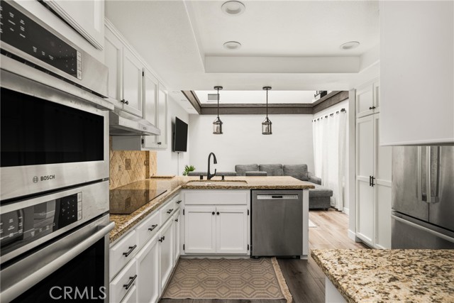 Upon entering, you'll be immediately enchanted by the sweeping vistas that surround the home, creating a peaceful, serene atmosphere. The lower level features a chic remodeled half bath, complete with modern fixtures and elegant finishes. The kitchen is a chef’s dream, equipped with high-end Bosch appliances and gorgeous granite countertops. It opens effortlessly to the spacious family room, where soaring ceilings enhance the sense of openness and light. Whether you're cooking or hosting, this space is perfect for creating memorable moments.