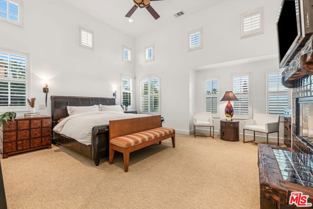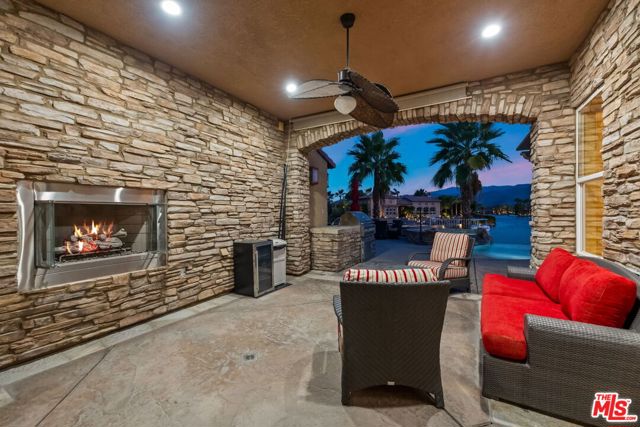 RARE OPPORTUNITY TO OWN ONE OF THE MOST SPECTACULAR AND LARGEST HOMES IN SANTO TOMAS!!! LUXURY LAKE FRONT DESERT LIVING AT ITS FINEST!!! Perfectly situated on a premium SOUTH-FACING lot in the highly desirable gated lake community of Santo Tomas, 64 Via Santo Tomas offers a unique south-facing backyard with plenty of luxurious amenities - infinity pool with a tanning ledge, hot tub, built-in BBQ station, fire pit, fireplace, and steps leading to the massive private dock. Located at the center of the community with unobstructed open water views of the nine acre lake, this home (one of only three) is perfectly situated directly across from the main entrance gate. The 3,350 sqft house boasts four bedrooms and four-and-a-half bathrooms (four are en-suite) with upgraded Kentucky Oak floors, security system, two car garage with plenty of storage space, two indoor fireplaces (one gas and one wood-burning), a bar area, and separation of bedrooms for added privacy. Granite countertops, stainless steel appliances, plenty of cabinets, and a walk-in pantry in the massive kitchen allow for easy entertaining. Two of the bedrooms can be used as an attached casita with a separate entrance door. Home comes fully furnished and has many upgrades - roof (2023), HVAC unit (2024), air conditioned garage, misters in the covered patio, and so much more. Low HOA dues includes a social and sports membership to the Mission Hills Country Club (pool, tennis, fitness, croquet, pickleball, restaurant). Enjoy desert living at its finest!