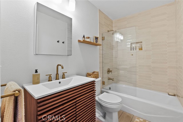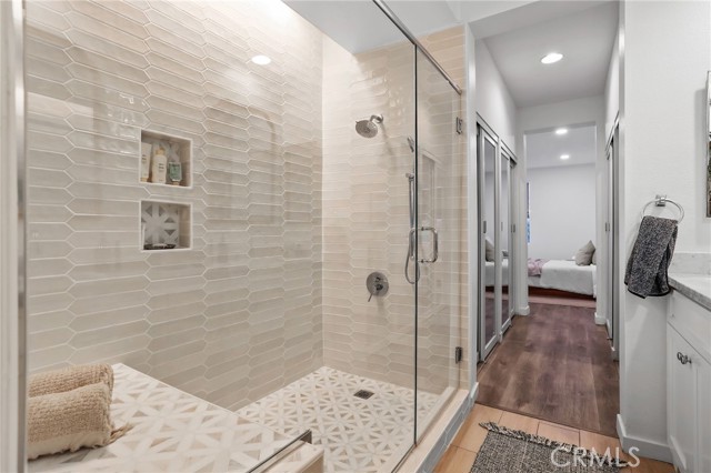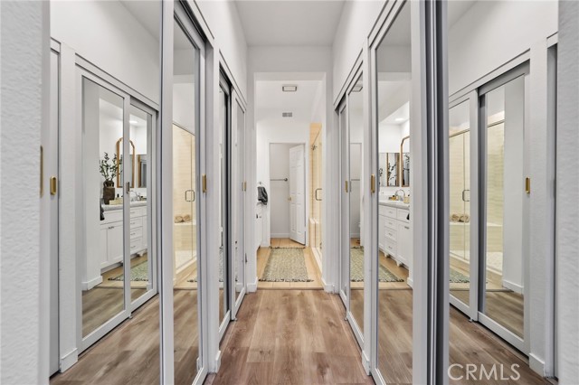 The spacious primary suite offers two walls of mirrored closets and a completely remodeled en-suite bath with dual vanities, Carrara marble countertops, a new walk-in shower, updated sinks, faucets, mirrors, and medicine cabinets.