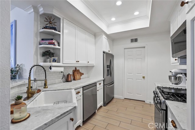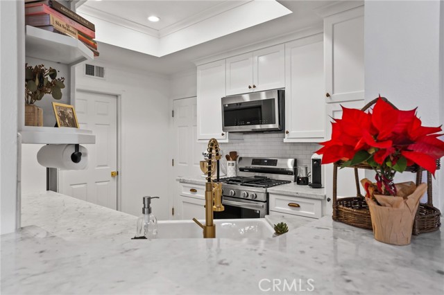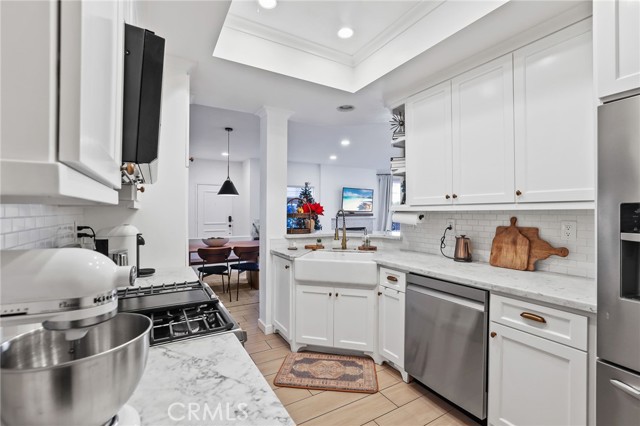 The beautifully remodeled interior offers a light-filled living and dining area with 9-foot ceilings and upgraded ceramic tile wood-style flooring throughout. The fully remodeled kitchen showcases, custom cabinetry, Carrara marble countertops, recessed lighting with under-cabinet illumination, crown molding, and new stainless-steel appliances, all included. A gas range with double ovens and a refrigerator water line provide both style and functionality.