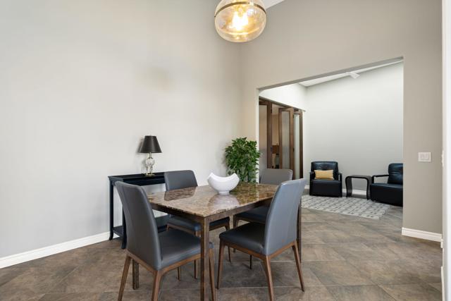 One of the best views in The Lakes Country Club! This residence enjoys a stunning lake setting with a waterfall and a fountain, perfectly positioned along the 7S fairway with a golf-ball-safe orientation. Designer paint is thoughtfully and cohesively used throughout, enhancing the home's light.The sun-filled living room features vaulted ceilings, a stone fireplace, and built-in shelving and cabinetry. An extended patio with fencing and a built-in BBQ creates an ideal outdoor living space overlooking the lake.The updated kitchen features KitchenAid stainless-steel appliances, upgraded granite countertops and backsplash, and a crisp, polished design that feels both current and functional. A lovely chandelier highlights the dining area.Both bathrooms have been updated with premium shower enclosures and new toilets. Updated Stone countertops keep it light and fresh with skylights that provide abundant natural light. The spacious primary bedroom features a remodeled walk-in closet and a large en suite bath. The enclosed atrium now serves as a retreat for sitting, with two skylights and beautiful wood-and-glass bi-fold doors to the adjacent Den. The Den is used as a bedroom and features a closet, a custom-built-in desk with shelves, and a door to the bathroom.Additional features include deep baseboard moldings, new electric window shades, a Maytag washer and dryer, and new electrical breakers. Upgrades completed in 2022 include a new HVAC system with premium surge and overload protection, a new water heater with recirculating pump, and a 3/4-HP garbage disposal, and ceiling fans throughout.The garage offers epoxy flooring, a new LiftMaster garage door opener with a keypad, and ample built-in storage cabinetry.An exceptional opportunity to own a beautifully upgraded unit in The Lakes Country Club.