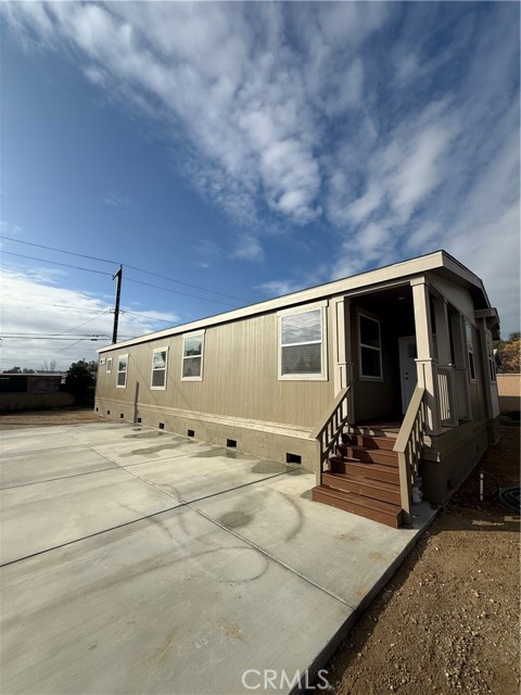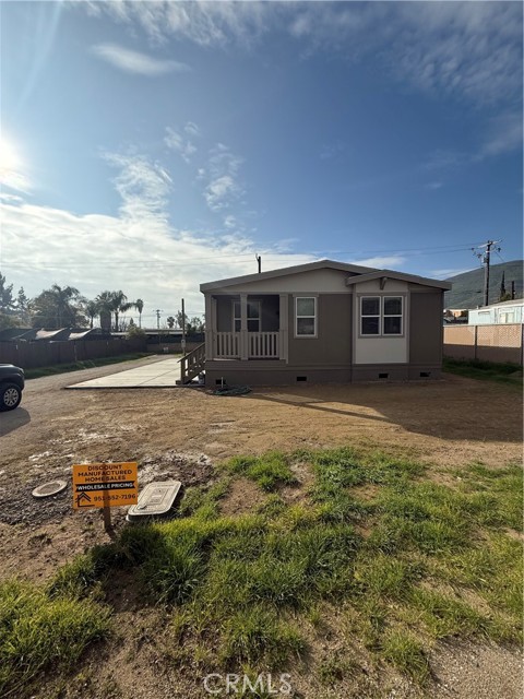 Welcome to this Brand New Manufactured Home on a permanent foundation, located in Hemet. This 3-bedroom, 2-bath home features a charming front porch and a bright, open floor plan. The kitchen is highlighted by quartz countertops throughout, ample cabinetry, and a spacious walk-in pantry, making it perfect for everyday living and entertaining. The primary suite offers a relaxing retreat with a large walk-in closet and private bath. Quality finishes and functional design make this home move-in ready and a must see.