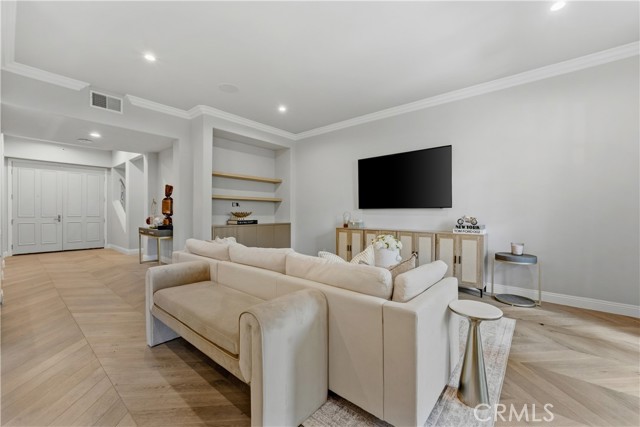 The main level features a sun-filled living room with a custom wet bar and seamless indoor to outdoor flow to the first of two private terraces. A chef’s kitchen with Miele appliances and marble slab countertops anchors the space, while a flexible guest suite or private office with a full bath completes the lower level.