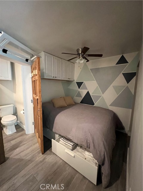 The living room and dining area offers a five foot dining table, a spacious closet and a one of a kind built in bar. The sofa converts into a guest bed and a television is provided. The bed is in an enclosed area which includes a queen size bed and an upgraded bathroom. A hidden storage door allows for efficient airflow from the air conditioning and heating system.