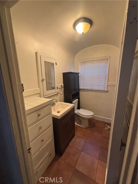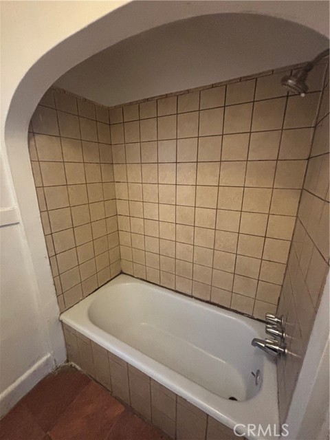 A convenient service porch with laundry hookups leads directly to the backyard. The home features two spacious bedrooms, each with walk-in closets, and a centrally located tiled bathroom with a shower-over-tub combination.