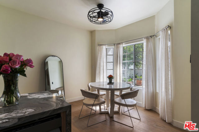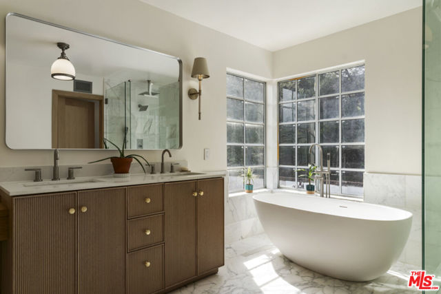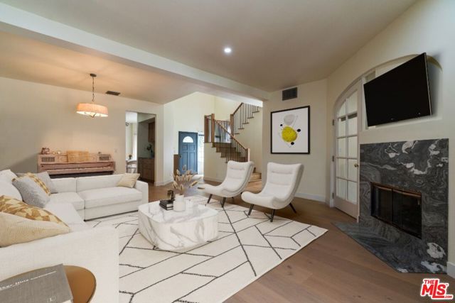Stop searching. Call your moving company. It's time to submit your offer. This completely renovated North Ranch townhome in the Braemar community of Westlake Village offers 2,057 square feet, 2 bedrooms, and 3 bathrooms with high-end, thoughtful finishes throughout. Flooded with natural light, the home is complemented by soaring ceilings and oversized windows that create volume and openness from the moment you enter. A dramatic two-story entry showcases a Timothy Oulton Frozen Ring pendant suspended above the staircase, establishing a striking architectural focal point. White oak floors flow seamlessly across both levels, paired with custom white oak cabinetry and matching stair detailing for a cohesive, intentional design. The powder room is finished with limestone tile, an onyx sink, and curated fixtures. The kitchen balances form and function with marble countertops, a waterfall stone peninsula, GE and Samsung appliances, and a farmhouse sink. The main living area centers around a statement marble fireplace and opens through French doors to a private landscaped patio designed for effortless indoor-outdoor living. Upstairs, a versatile flex space offers room for a home office, gym, or secondary lounge. The primary suite delivers a spa-level experience with Calacatta marble floors and walls, a freestanding soaking tub framed by oversized windows, a glass-enclosed shower, and a custom vanity. The guest suite is complete with its own sitting area and a beautifully finished custom bathroom. Located in North Ranch, minutes from Boccaccio's, The Landing Grill & Sushi Bar, and The Promenade at Westlake with boutique retail and dining. HOA amenities include a community pool, spa, tennis and basketball courts, and a private park.