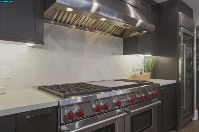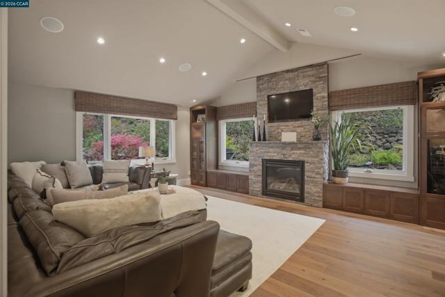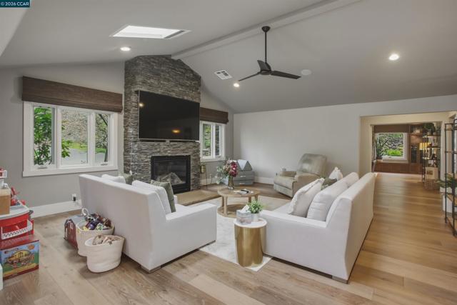 Tucked in the coveted Lakewood neighborhood, this breathtaking single-story Craftsman offers estate-style living. Two oversized living rooms showcase soaring ceilings, custom hardwood floors, built-ins, picture windows, gas fireplaces, and a drop-down movie screen for effortless entertaining. The chef’s quartz kitchen is appointed with top-tier Wolf appliances; including a 60" range with double griddle, and a built-in coffee maker, a Sub-Zero refrigerator, and a full-size wine fridge, all flowing seamlessly into the formal dining room. The luxurious primary suite features a private sitting area, dual walk-in closets, a spa-inspired bath with soaking tub, oversized shower, plus dual vanities and a private French door to the backyard. Three additional bedrooms are en-suite, each with generous closets and abundant natural light. A designer 842± sq ft ADU (2 bed, 1 bath) offers its own fireplace, gourmet kitchen, and sleek bathroom—ideal for guests or extended family. The resort-style grounds include an outdoor kitchen, dramatic waterfall, multiple seating areas, fire pit, and saltwater pool with Cabo deck. Complete with abundant storage, a two-car garage, additional parking, and just minutes to downtown Walnut Creek, trails, parks, BART, freeways, and top-rated Walnut Creek schools.