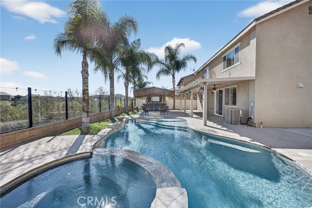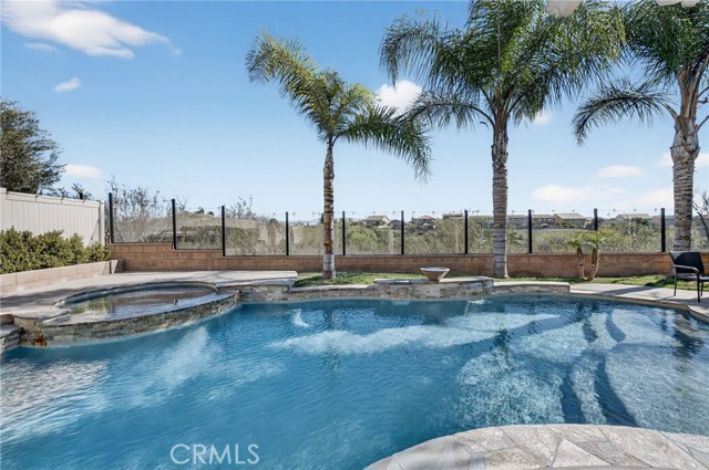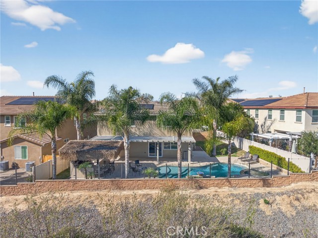 Step outside and experience a backyard designed for unforgettable gatherings. The resort-style pool and spa with PebbleTec finish are complemented by a dramatic fire bowl, built-in fire pit, and a tiki bar complete with gas grill, under-counter refrigerator/kegerator, built-in TV, speakers, and ambient lighting. The authentic palapa-style thatched roofing creates the ultimate tropical vibe, while the full-length Alumawood patio cover provides shade and comfort year-round. The plexiglass rear fencing preserves breathtaking mountain views and open-space greenery, delivering complete privacy with no homes behind. A large side yard adds additional flexibility and functionality.