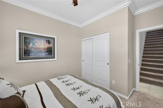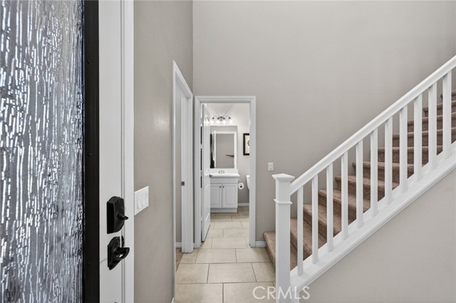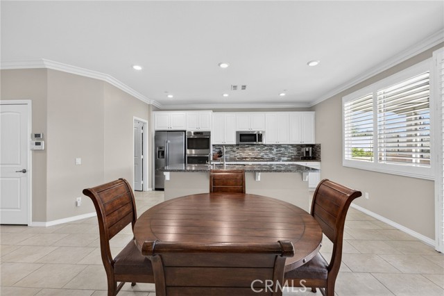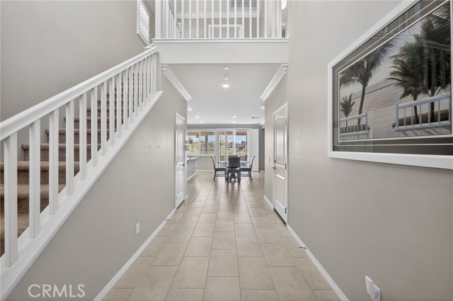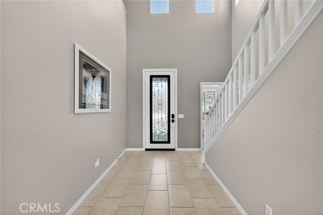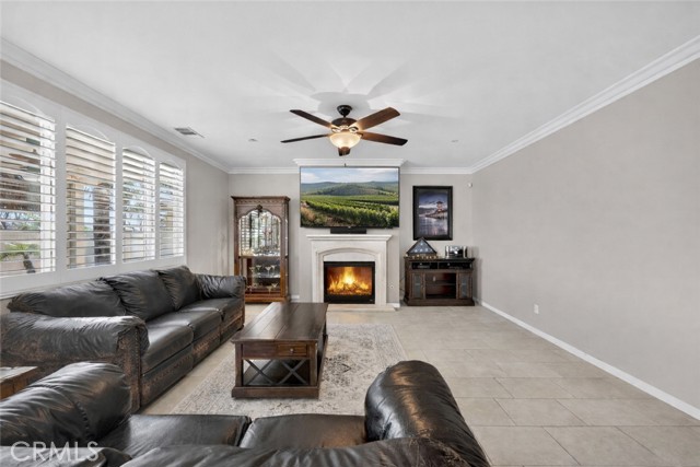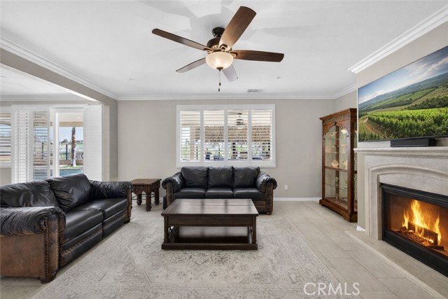Inside, the home continues to impress with a bright, open-concept floor plan and extensive upgrades throughout. The spacious kitchen features a large central island, granite countertops, custom backsplash, white cabinetry, double ovens, stainless steel appliances, and a huge walk-in pantry. Tile flooring runs throughout the main living areas downstairs, anchored by a cozy fireplace in the great room. Crown molding, plantation shutters, and LED lighting enhance the home’s refined yet comfortable feel. The custom glass front door includes an operable panel, allowing refreshing cross-breezes throughout the home.