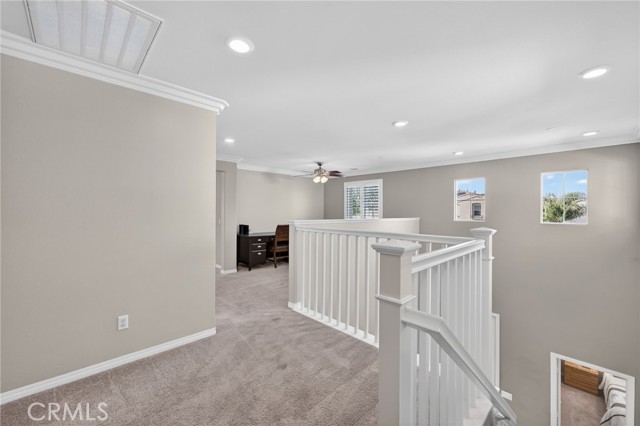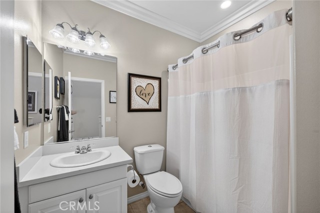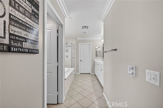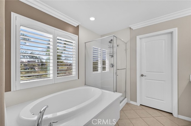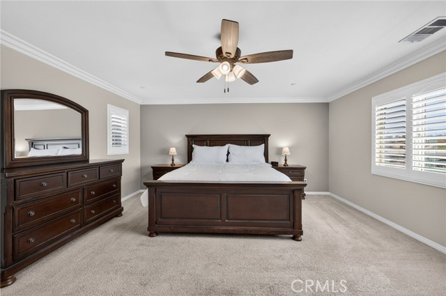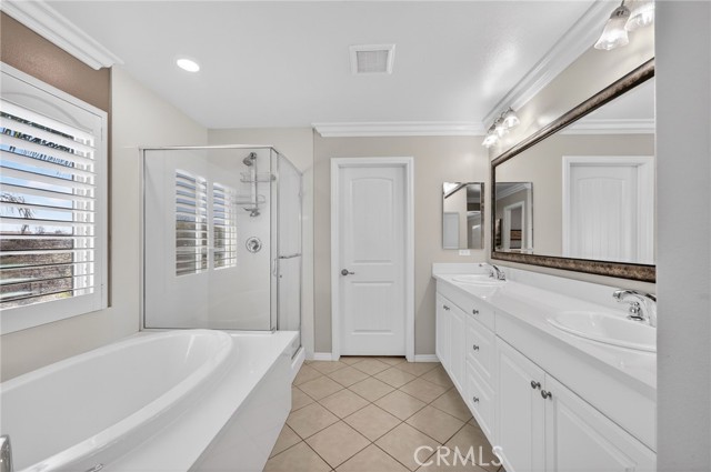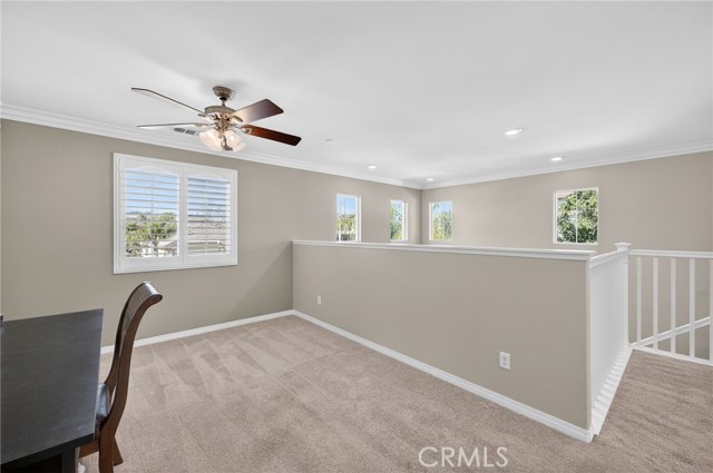 The thoughtful layout includes a downstairs bedroom and nearby three-quarter bath—ideal for guests or multigenerational living. Upstairs, you’ll find a generous open loft, two secondary bedrooms sharing a full bath, a convenient upstairs laundry room, and a spacious primary suite. The primary retreat offers a soaking tub, separate walk-in shower, dual vanities, and a large walk-in closet, all finished with the same crown molding and plantation shutters found throughout the home.