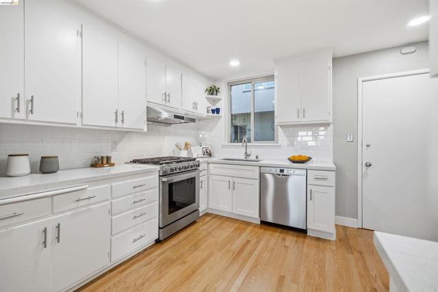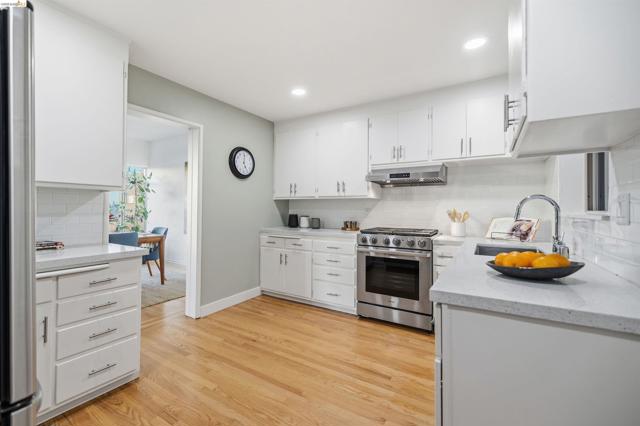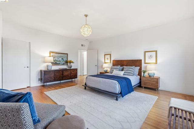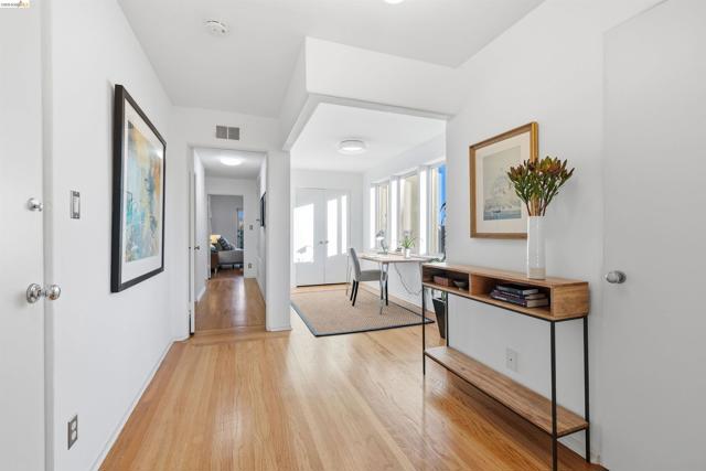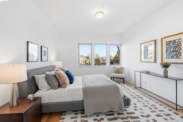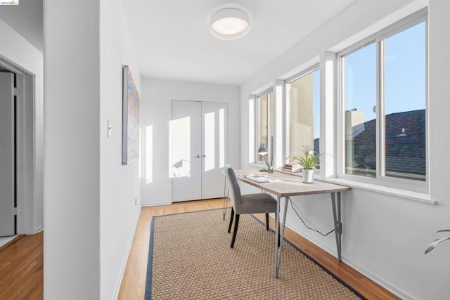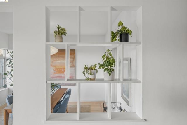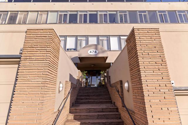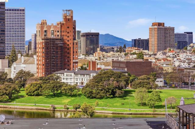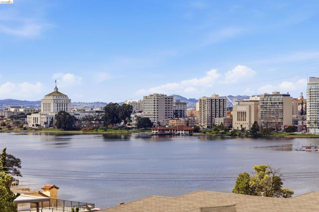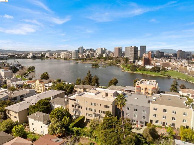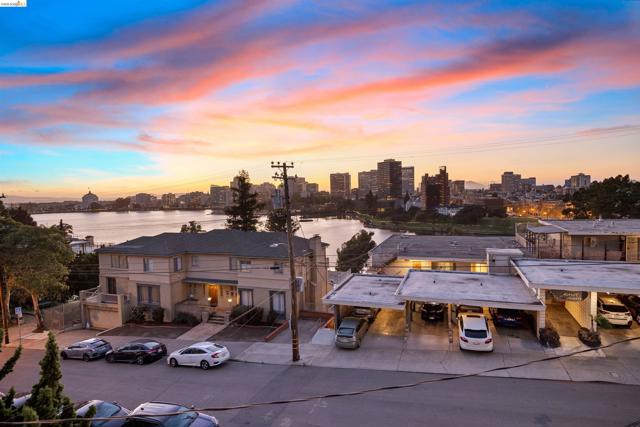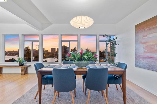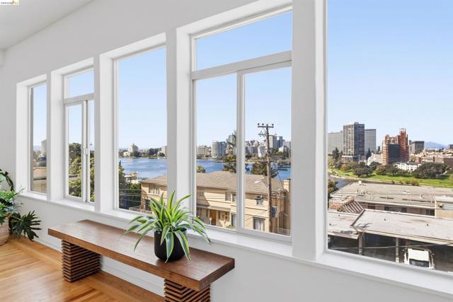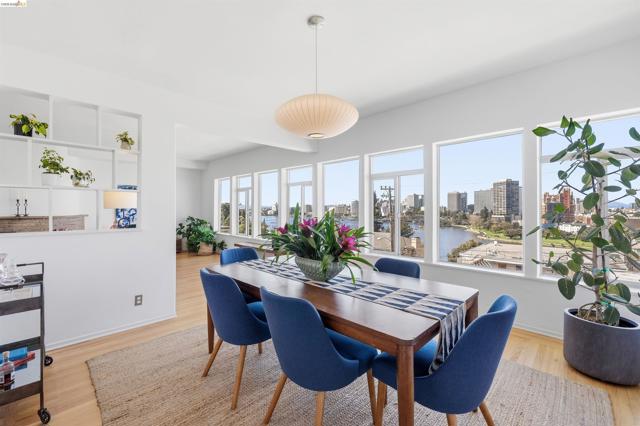 Perched on the edge of Lake Merritt, this 1,649-SF corner residence lives like a house in the sky. A full wall of west-facing windows floods the living room with light and front-row sunsets stretching all the way to Mount Tam & SF. Golden hour here feels cinematic. Lake views follow you into the formal dining room, elevating weeknights and dinner parties alike. The updated kitchen pairs stainless steel appliances with generous counters and storage. Built in 1951, the home blends clean mid-century lines, hardwood floors, and timeless character. A spacious entry with bonus nook makes an inspiring office or add a wall for a third bedroom with closet. The stone fireplace with wraparound mantle anchors the living room, with a wall of built-ins for books, art, and vinyl. The oversized secondary bedroom offers three closets, built-ins, architectural detail, and room to flex—lounge, studio, or epic media room. The primary suite features ample closets, more sweeping views, and a private full bath with tub for unwinding. A dedicated garage provides easy off-street parking, and a shared sunny level garden offers fresh-air escapes. Just outside: miles of waterfront paths, the historic Cleveland Cascade, and the vibrant Saturday farmer’s market. Big-space living. Iconic Oakland views. Views: Downtown
