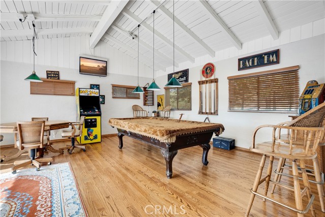 Complementing the residence is a 660 sq ft detached guest house, currently arranged as a game room overlooking the outdoor entertaining areas. Inside, a rustic bar and private bathroom add convenience, making the space well suited for hosting guests, a studio, or future guest quarters.