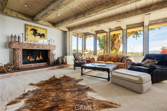 The 3,443 sq ft main residence sits atop a hill surrounded by mature trees that provide natural privacy. With outdoor access from nearly every room and a seamless connection to the landscape, the home embraces an effortless indoor-outdoor lifestyle. A wooden double-door entry opens to warm rustic interiors. The kitchen is complemented by a butler pantry, separate laundry room, and a dining room overlooking the living area below, supporting an easy flow for daily living and entertaining. The sunken living room, framed by exposed wood beams and anchored by a flagstone fireplace, opens to sweeping valley views.