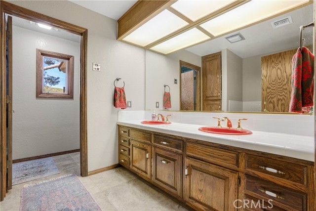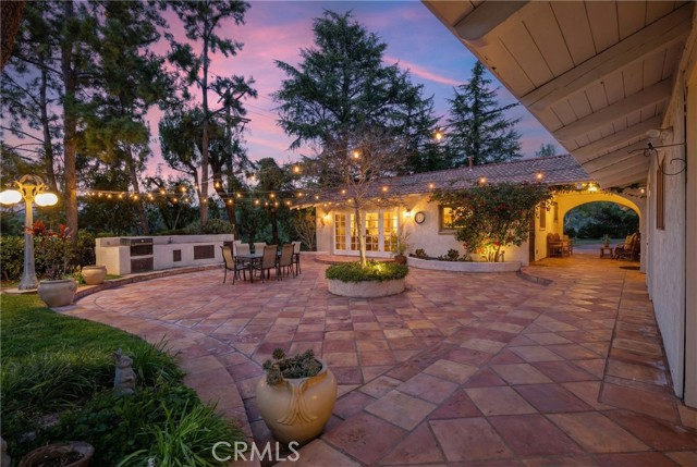 Outside, the grounds offer inviting gathering spaces. A stone patio along the rear overlook captures sunrises over the Santa Clarita Valley, while the patio and BBQ area between the main home and guest house create a natural setting for entertaining. Mature trees provide shade throughout the property, with a hammock beneath the canopy and a winding driveway enhancing the home’s quiet arrival.