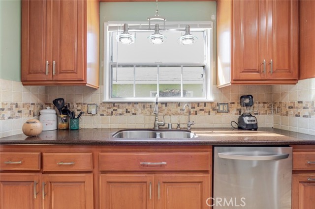 The interior features refinished real hardwood floors, double-pane windows, recessed lighting, ceiling fans, and central HVAC. The spacious eat-in kitchen has been tastefully updated with stone countertops, stainless steel appliances, custom Alder wood cabinetry, a pull-out pantry, and a built-in wine rack, perfect for both cooking and entertaining.