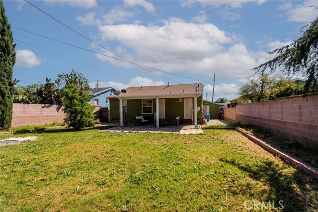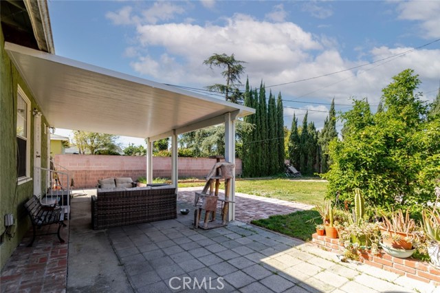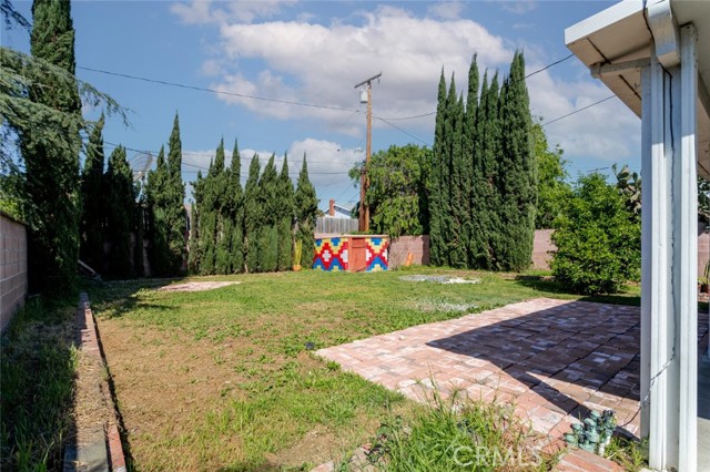 A private backyard oasis, an oversized entertainer's paradise surrounded by mature Cypress and fruit trees, with a large grassy area, brick and stamped concrete patio details, and ample room to relax, host guests, or play. A long driveway leads to an attached 2-car garage, providing plenty of parking and storage.