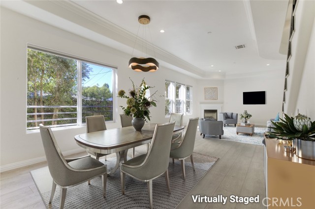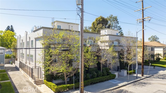 Welcome to this bright and private, rear end-unit stylish townhouse located in a desirable Valley Village neighborhood, offering 1,290 sq ft of comfortable living in a quiet, secure community. This home features updated luxury vinyl flooring, with the main level has an open and airy floor plan with a living room filled with natural light from multiple windows, a decorative fireplace, elegant crown ceilings, recessed lighting, and a dining area that flows seamlessly into the updated kitchen with stainless steel appliances and generous cabinet space. A convenient powder room completes the first floor. Upstairs are two spacious bedrooms, each with its own private ensuite bathroom and large closets, providing comfort and privacy. The hallway laundry area adds everyday convenience. On the top level, is your private rooftop patio, perfect for relaxing, entertaining guests, or enjoying the views. Additional features include two parking spaces in a secured subterranean garage. The community is disabled-friendly with an elevator lift. The 12-unit complex is well-maintained. HOA covers water, trash, earthquake insurance, and maintenance of common areas. Convenient location: near studios, schools, shopping, eateries, entertainment and freeways. This home offers the perfect blend of style, privacy, and convenience.