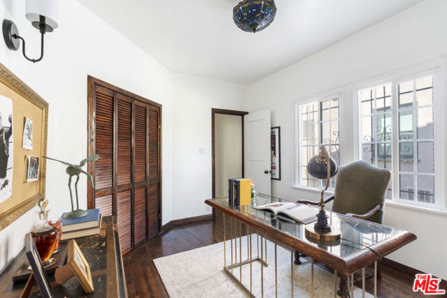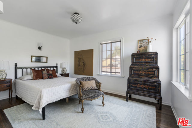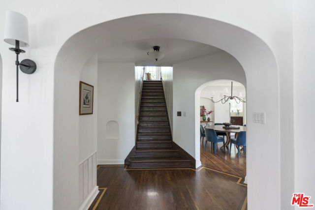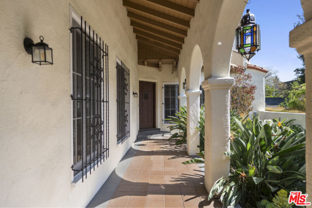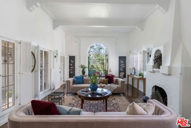Set far back from the street in the coveted Brookside neighborhood, this enchanting 1926 Spanish Colonial offers a peaceful retreat in the heart of the city. A serene front courtyard welcomes you through the gate, setting the tone for the home's timeless charm. Inside, corbel-style beamed ceilings and hardwood floors create an airy, elegant atmosphere. The living room is anchored by a fireplace and a grand arched picture window that fills the space with natural light, while classic archways and Spanish detailing add warmth and character. The remodeled kitchen blends beauty and function with custom wood cabinetry, granite countertops, stainless steel appliances, custom lighting, and a beverage cooler. A charming breakfast room offers space for casual dining or a work-from-home nook, while the formal dining room is perfect for gatherings. The main level also includes a bedroom, a full bath, and a laundry room. Upstairs, two additional bedrooms and a spacious primary suite provide a quiet retreat. The primary suite opens to a second-floor balcony overlooking the courtyard, an inviting spot for morning coffee or evening relaxation. The private backyard offers flexible outdoor space for dining, gardening, or entertaining. A detached two-car garage and extended driveway provide convenient off-street parking. Recent upgrades include a relined sewer line, HVAC system, gutters & water heater. Ideally located in Brookside, between Larchmont Village and The Grove, this home is just minutes from local eateries along La Brea and Wilshire like Republique, Apollonia's Pizzeria, Met Him At A Bar, Met Her At A Bar, The Night We Met, and All Seasons Brewery. Enjoy the newest Pickleball courts at Pikl, the historic El Rey Theatre, and The Ebell, making this one of Los Angeles' most vibrant and desirable neighborhoods.