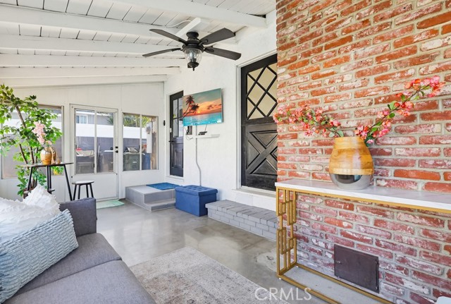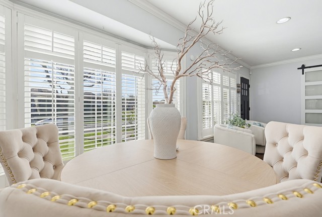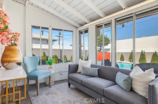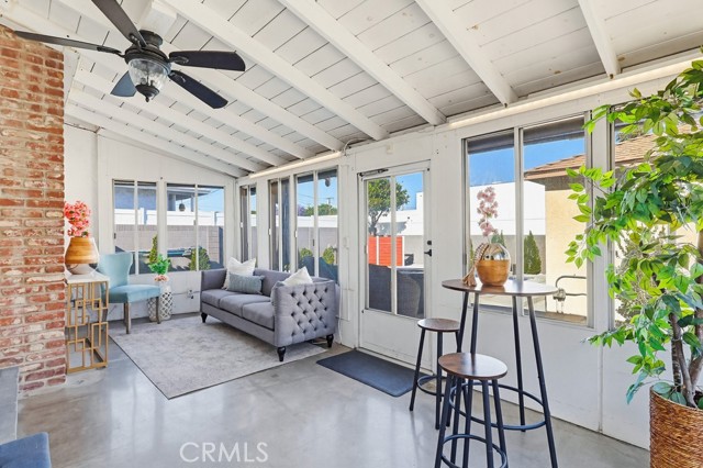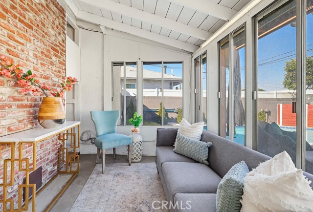 A versatile rear bonus room with open beam ceilings and expansive windows offers the perfect space for a family room, game room, or indoor-outdoor entertaining area, with direct access to multiple patio spaces.