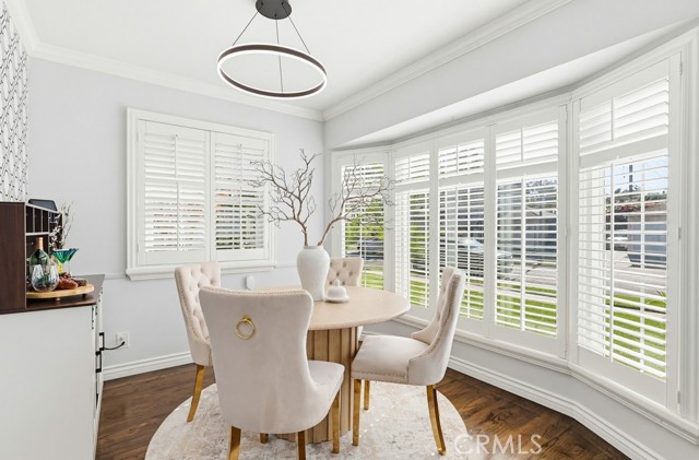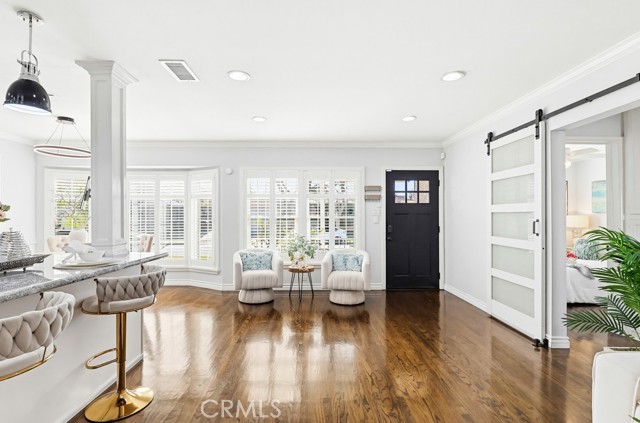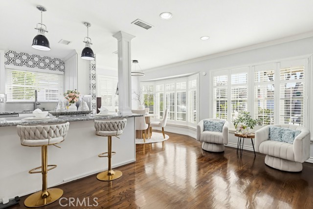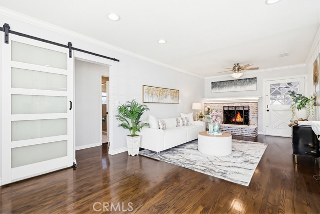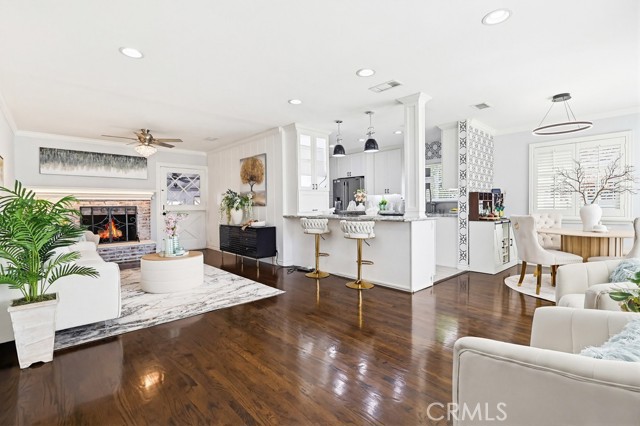 A welcoming brick walkway and inviting curb appeal lead you into a bright, open-concept floor plan designed for comfortable everyday living and effortless entertaining. The spacious living room is filled with natural light and features a raised hearth brick fireplace, crown molding, recessed lighting, and a cozy window seat with plantation shutters.