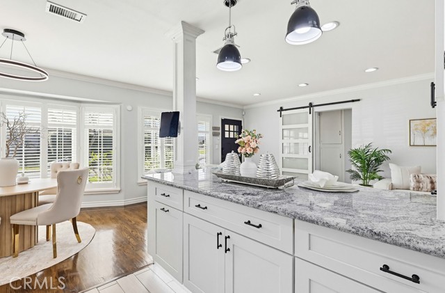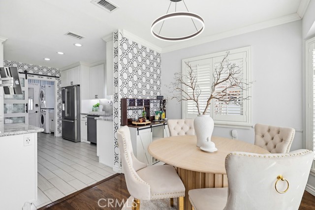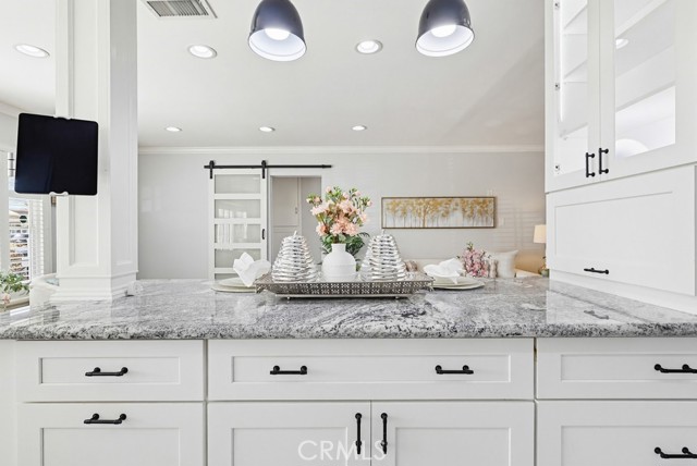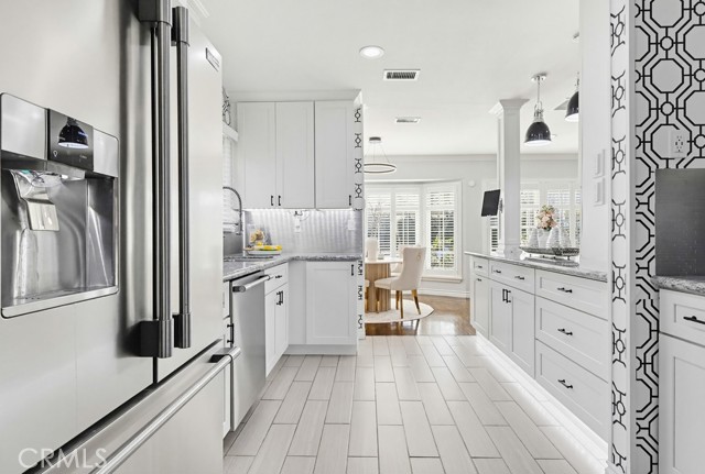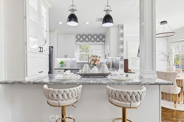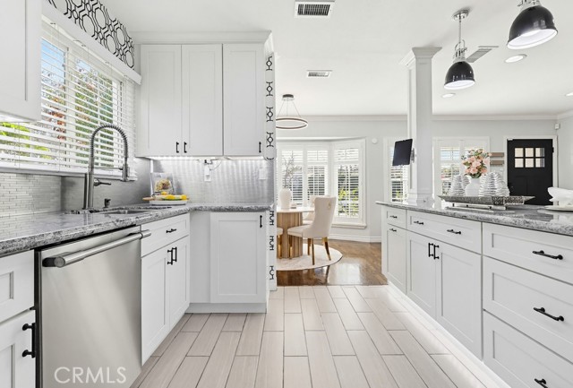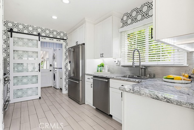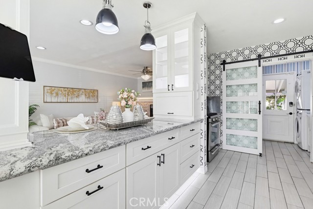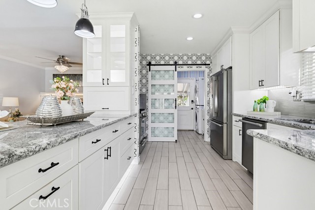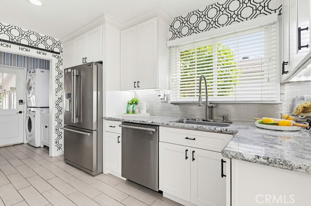 The updated kitchen has been thoughtfully modernized and opens directly to the living area, creating a seamless flow. It showcases a large granite island, ample cabinetry, granite countertops, a stylish tile backsplash, and stainless steel appliances—perfect for both hosting and daily use. Adjacent to the kitchen is a dedicated laundry room and convenient guest bath.