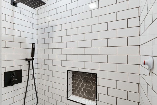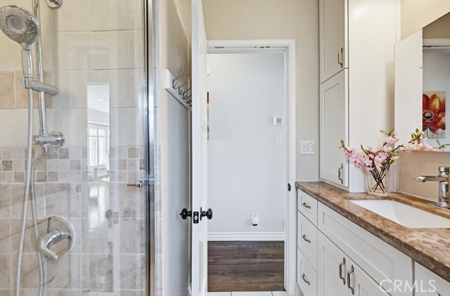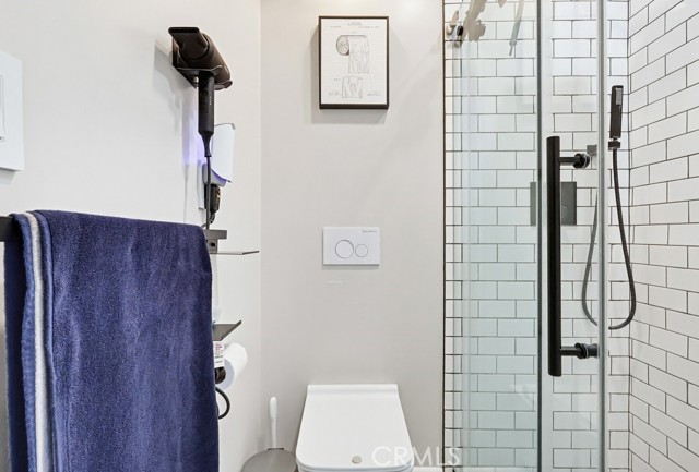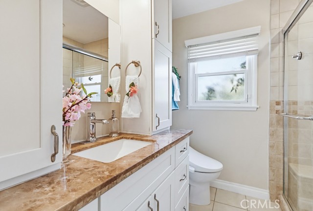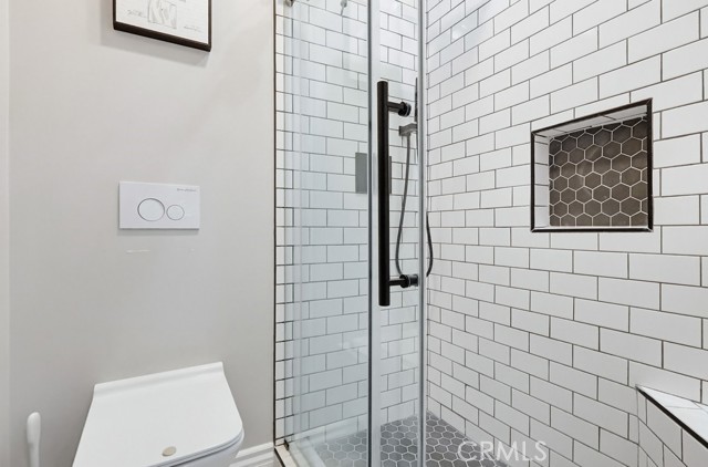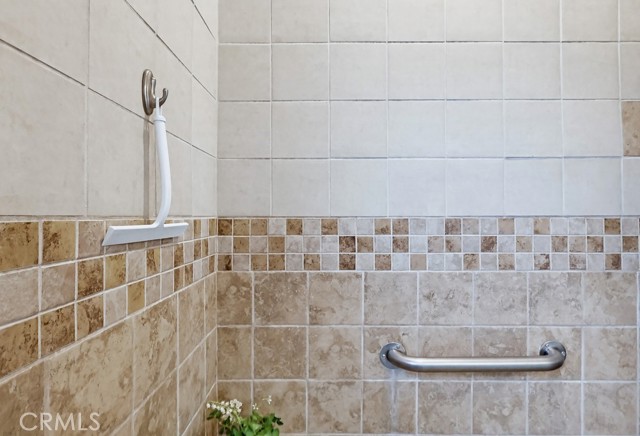 The home offers 2 bedrooms and 1¾ bathrooms, including a recently added three-quarter bath with a shower and toilet, as well as a fully remodeled primary bathroom featuring a walk-in shower with a built-in bench.