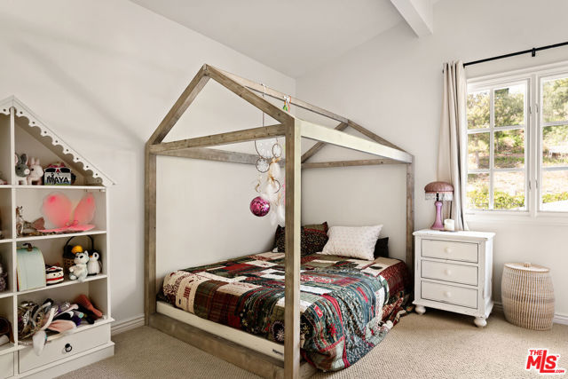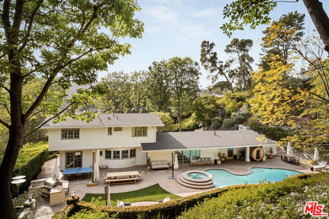 Tucked away in the exclusive Westridge Hills, this custom-built sanctuary offers an unparalleled blend of privacy, elegance, and modern comfort. A long gated driveway leads to this exceptional estate, set on a sprawling, flat lot that provides both seclusion and ample space for luxurious living. The home features four bedrooms, four and a half baths, and primary suites on both levels, offering flexible living arrangements. Vaulted ceilings and abundant natural light enhance the open-concept design, where French doors seamlessly connect the indoor spaces to a lush, resort-like backyard. The expansive outdoor oasis boasts a swimmer's pool, hot tub, and a sprawling patio with an outdoor fireplace, built-in BBQ, and full kitchen--including a double sink and refrigerator--perfect for entertaining. A serene waterfall cascades down the hillside, adding a touch of tranquility. Upstairs, a loft-style office and three additional bedrooms offer space for work, rest, and play. The primary suite features high vaulted ceilings and a cozy window seat overlooking the lush landscape. The gourmet kitchen is a chef's dream, showcasing two islands, two dishwashers, custom cabinetry, and a large walk-in pantry. The enormous family room with a wet bar and full bath opens directly to the backyard, creating an effortless indoor-outdoor flow. Freshly refinished hardwood floors, new carpeting in select rooms, and a fresh coat of paint inside and out make this home truly move-in ready. An attached two-car garage with a newer door and additional parking for multiple vehicles completes the property. Experience the feeling of a private retreat, right in Los Angeles--where luxury, comfort, and seclusion come together in perfect harmony.