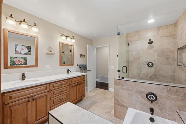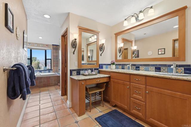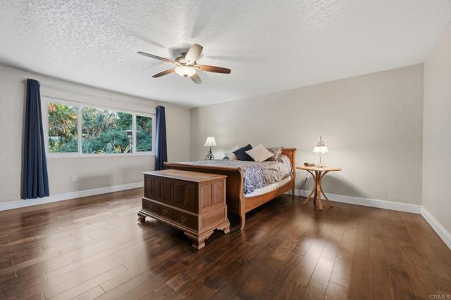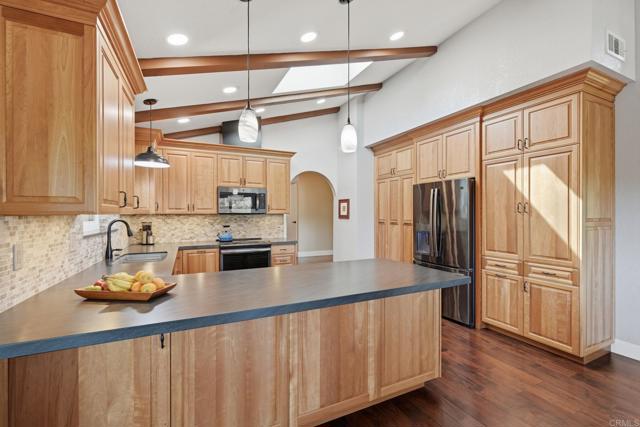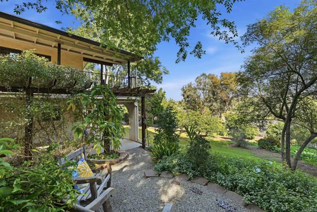 With the greenly spirit of trees and a true blue dream of sky, celebrate the art of living in this extremely private, tranquil retreat located in a country pocket of Vista. Combining old world charm with contemporary living, this 2851 esf home includes a separate 1Br/Ba/LR/Kit apartment - perfect for rental, family or private studio. *** After a small series of steps to enter, the main residence is basically a single level 3Br, 2Ba home flooded with natural light and boasting Acacia Caramel Macchiato engineered wood floors, vaulted beamed ceilings, solar tubes, ceiling fans and cozy fireplace. *** Kitchen is the heart of the home accented with skylight and boasting leather granite countertops, travertine backsplash, cherry cabinets with pullouts, GE Profile appliances, induction range & farmers sink. *** Primary suite is complete with an eclectic bath featuring Saltillo tile, granite countertops, fiesta sinks and luxurious jacuzzi soaking tub. *** Large, elevated .93 acre lot offers vibrant, lush landscaping, vignettes of country views, serene sitting areas, and an assortment of fruit and nut trees while still leaving ample space for a pool, detached ADU, RV, gardens . . Fully Paid SOLAR.