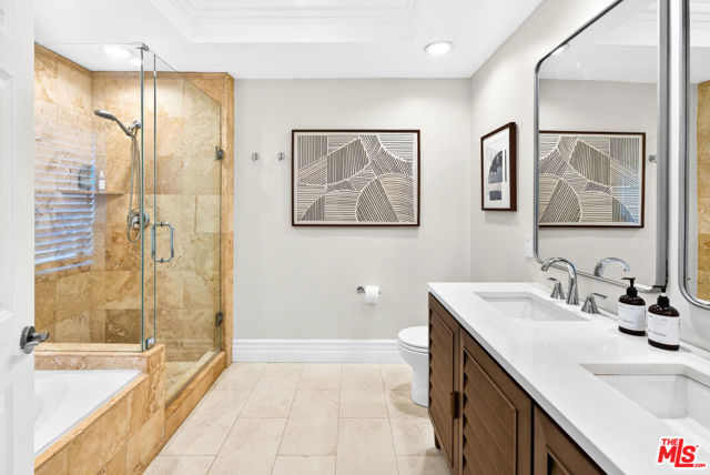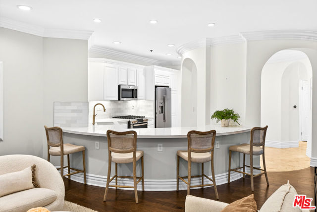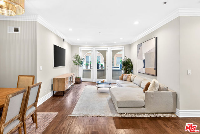 Located on a quiet, tree-lined street between Westwood and Century City, this beautifully updated 2-bedroom, 2-bath residence offers approximately 1,569 sq. ft. of light-filled living in a Mediterranean-style building. A secure entry leads through a charming open-air courtyard with a fountain, setting a welcoming tone before entering the residence. Inside, a thoughtful floor plan unfolds with a foyer, an open kitchen with an adjacent family room, and a spacious living area designed for both relaxed daily living and easy entertaining. The bedrooms are positioned on opposite sides of the residence, providing privacy and separation. The primary suite features a walk-in closet space, a tub, and direct access to a large, covered balcony. Multiple rooms open to the balcony, creating a seamless indoor-outdoor flow and extending the living space for morning coffee, dining, or evening gatherings. Architectural details include wood floors, crown moldings, graceful arches, tilework, and tall ceilings. Additional amenities include gated underground parking with two tandem spaces and guest parking. Ideally located just moments from Westwood Village, Century City, UCLA, and many of the Westside's most popular dining and shopping destinations.