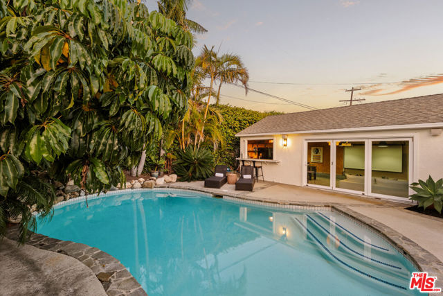 Set within the highly sought-after Kentwood Elementary school district, this thoughtfully updated four-bedroom, two-bathroom home offers a flexible layout, inviting living spaces, and a backyard designed to be enjoyed. With two bedrooms and two bathrooms on the main level, including a well-appointed primary suite, the home is well suited for a variety of living arrangements. The main floor is filled with warm west-facing light, creating an inviting atmosphere in the living room, where built-in bookshelves and a wood-burning fireplace serve as a natural focal point. A formal dining area connects to the remodeled kitchen, finished with custom gray cabinetry, ample counter space, and a subway tile backsplash. Double ovens, a smart refrigerator, and an eat-at peninsula with pendant lighting and a wine refrigerator make the space as functional as it is welcoming. Just beyond, the family room offers additional flexibility with built-in storage and French doors that open directly to the backyard. Positioned for privacy, the primary suite on the main level opens to the outdoor space and includes a walk-in closet and a remodeled bathroom with dual vanities, gold hardware and fixtures, black and gold hexagonal tile floors, custom wallpaper, and a marble-tiled shower with a rainfall showerhead and built-in niches. A secondary bathroom on this level features a soaking tub and a calming, spa-like feel. Upstairs, two additional bedrooms are filled with natural light and character, enhanced by dormer windows, skylights, and built-in study nooks that create comfortable spaces for work, reading, or play. The backyard is designed for both relaxation and gathering, anchored by a heated pool with a cascading waterfall and surrounded by lush landscaping. The gated driveway and hardscaped areas provide additional room for play, while still offering privacy and separation from the street. A standout feature of the property is the oversized garage, currently set up as a poolside retreat with eight-foot folding doors that open to the yard. Complete with a built-in bar, keg refrigerator with taps, and a projector with screen, it functions as an extension of the outdoor living space. This structure also presents an opportunity for future use as a guest house or potential ADU, or it can be returned to a traditional garage. Moments from the neighborhood's best schools and around the corner from local grocery stores and shops, this traditional beauty makes everyday living easy.