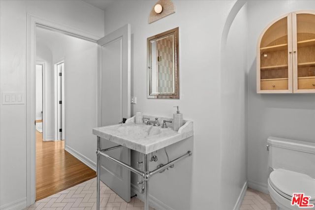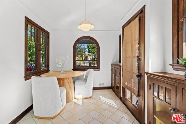 Charming English Tudor Revival on tree-lined Sierra Bonita in Wilshire Vista/Miracle Mile. This meticulously updated home blends historic character with extensive modern upgrades, including a fully built guest house. Set behind native landscaping, the property features a steep gabled roofline, turret, and original stained glass window. A double driveway leads to a private gated courtyard. Inside, the home showcases restored crown moulding, barreled ceilings, refinished hardwood floors, custom built-ins, and original crown glass windows. Formal dining room with arched ceilings flows into a chef's kitchen with custom cabinetry, Caesarstone counters, sealed Roca tile, and Fisher & Paykel, Wolf, and Bosch appliances. Breakfast nook and adjacent laundry room with LG washer/dryer. Primary suite includes custom closet and French doors to a rebuilt deck. Primary bath features herringbone tile, freestanding tub, and walk-in shower. Private backyard offers mature landscaping with citrus trees, jasmine, trumpet vines, and a vine-covered pergola. Converted garage functions as a guest casita with kitchen, built-ins, exposed beams, and full bath. Major upgrades: new 200-amp electrical panel with surge protection, upgraded grounding (main + guest house), high-efficiency Carrier Infinity HVAC with new ductwork, tankless water heater, seismic retrofit, structural repairs, attic insulation with radiant barrier, sump pump, foundation waterproofing, and French drains. Additional improvements include rebuilt fireplace, fresh interior paint, renovated closets, new ventilation, reverse osmosis system, updated guest house bath, recessed lighting, landscaping, security lighting, and termite treatment. Smart features: HVAC thermostat, tankless water heater, Moen Flo system, irrigation, smart locks, ADT security, and Nest cameras. Moments from Sonoratown, Dam Good Coffee, Bloom, LACMA, The Grove, and the 10 freeway.