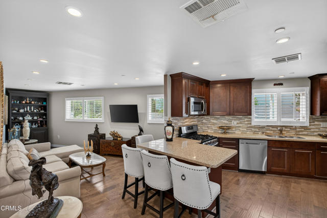 One of a kind property located in the highly desirable La Shell/Crystal View tract of Tujunga, this versatile multi-family estate truly functions like two homes on one lot. The main residence features bright, open living spaces with vaulted ceilings, recessed lighting, rich wood flooring, and a cozy fireplace, seamlessly flowing to a massive outdoor patio through expansive sliding doors. The updated kitchen showcases granite countertops, stainless steel appliances, and ample cabinetry, while spacious bedrooms offer comfort and natural light throughout. Step outside to an expansive backyard retreat complete with a sparkling pool, multiple lounging areas, and breathtaking mountain views--perfect for entertaining or relaxing in total privacy. The detached ADU is a standout feature, offering a modern open-concept layout with a full kitchen, two bathrooms, its own dedicated laundry room, and a private entrance from the main street. It also includes an oversized one-car garage with abundant storage and additional parking. Additionally, the main home retains its full two-car garage, a rare and valuable feature for properties with ADUs. With solar panels and beautifully maintained grounds, this property delivers exceptional flexibility, lifestyle, and long-term value.