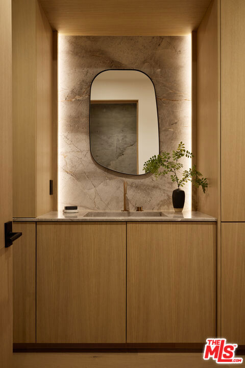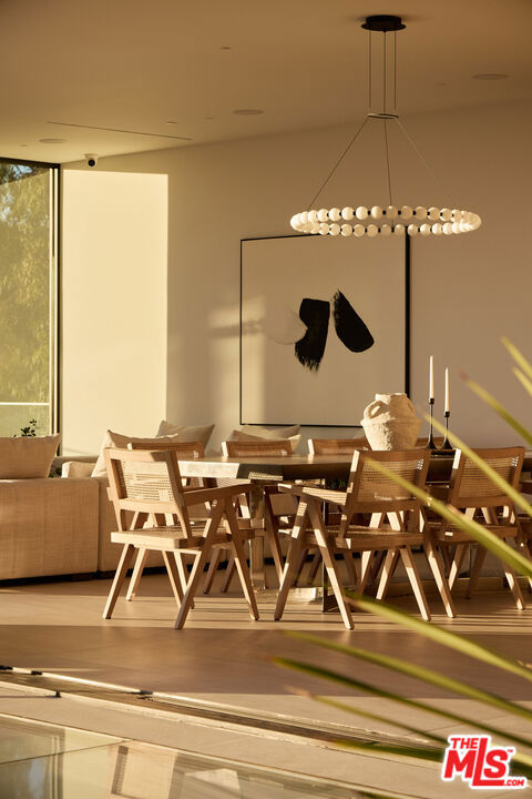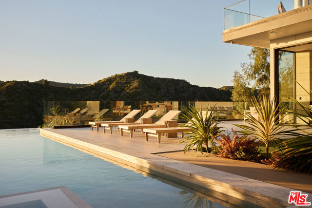 The Glassridge Residence. A Tadao Ando inspired organic modern with walls of glass that open to ocean and Getty views. Privately gated and set along one of Bel Air's most prominent ridgelines, the estate was newly completed in 2025 by Studio MD - AIA, with interiors by James Rosen. The main level is conceived as an open-plan environment with soaring 12' ceilings and sliding glass walls that connect living, dining, and kitchen spaces directly to the surrounding landscape. The kitchen reads like a gallery installation, featuring full-height travertine surfaces, a 15' waterfall island, and seamless, handle-less cabinetry that conceals an integrated Miele appliance suite, including double ovens and a built-in espresso machine. On the top level, a private vestibule with a stone-clad prep bar, integrated sink, and refrigerator precedes the primary suite, creating a quiet transition before the view reveals itself. Designed to honor its breathtaking setting, the bedroom is lined with floor-to-ceiling sliding glass walls that open to a wraparound private terrace, extending the suite outdoors and framing uninterrupted hillside and ocean views. The en-suite bath is resort-caliber, finished in travertine with a freestanding soaking tub, walk-in shower, and custom double floating vanities. A linear skylight draws natural light into the space, while a custom walk-in closet sits adjacent, integrated with matching wood millwork. The lower level is organized as a sequence of architectural moments featuring a linear corridor set against an exposed board-formed concrete wall, left intentionally raw, accented by wide-plank oak flooring. This level includes a private three-tier theater, temperature-controlled wine room, gym and steam shower, bar and lounge area that opens to a separate outdoor deck, all designed as a self-contained environment for leisure, wellness, and entertaining. A fully integrated Control4 system manages lighting, climate, audio, and security. The backyard showcases a 41' infinity pool that visually disappears into the landscape, flowing into a waterfall feature visible from the lower deck below. Lounge areas, dining zones, a built-in Alfa wood-fired pizza oven, grill, and a level lawn are arranged as distinct outdoor settings, all oriented toward the surrounding hills. 1149 Linda Flora Drive stands apart as an architecturally distinguished estate thoughtfully designed for privacy and wellness.