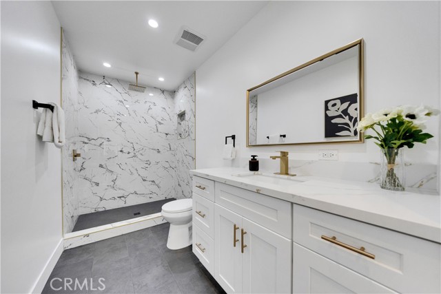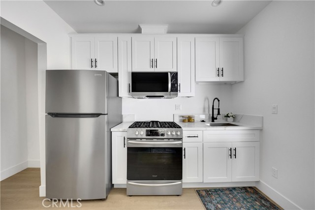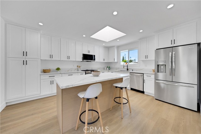 The fully remodeled kitchen is a standout feature, showcasing new cabinetry, sleek quartz countertops, and stainless steel appliances including a refrigerator, gas range, dishwasher, and microwave—perfectly designed for both everyday living and entertaining. Matching quartz finishes in the bathrooms create a cohesive, modern aesthetic throughout the home.