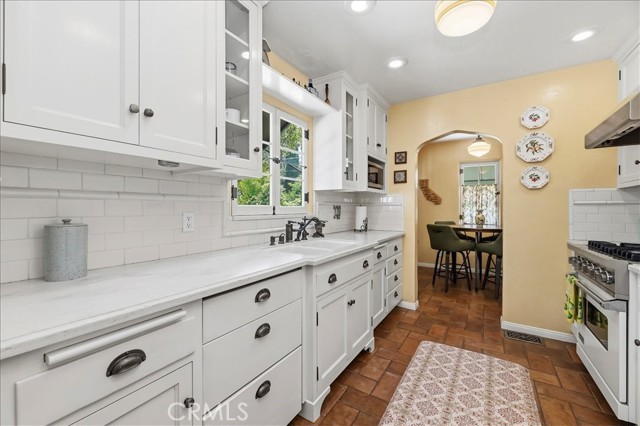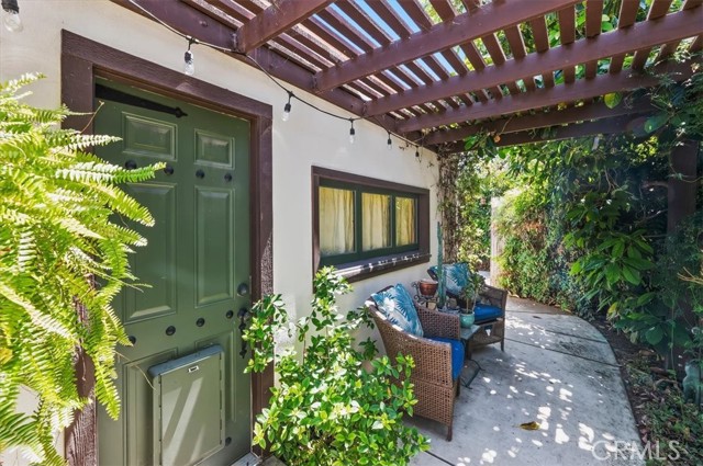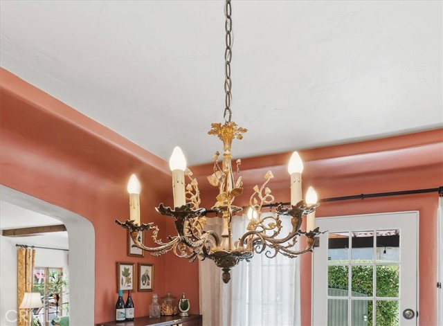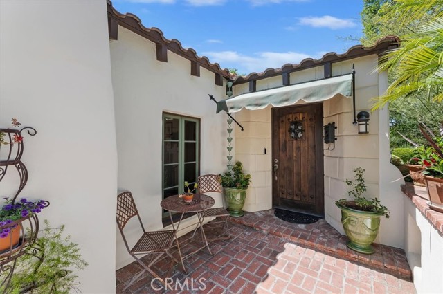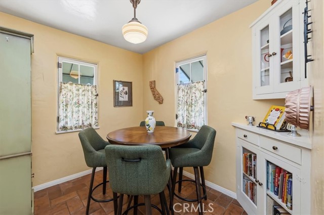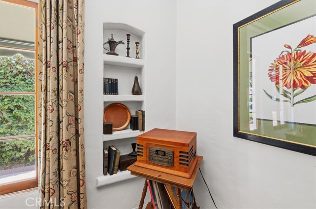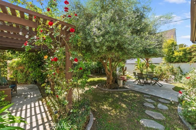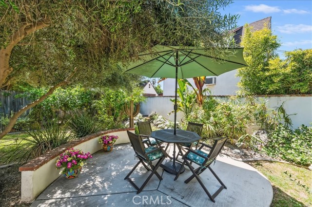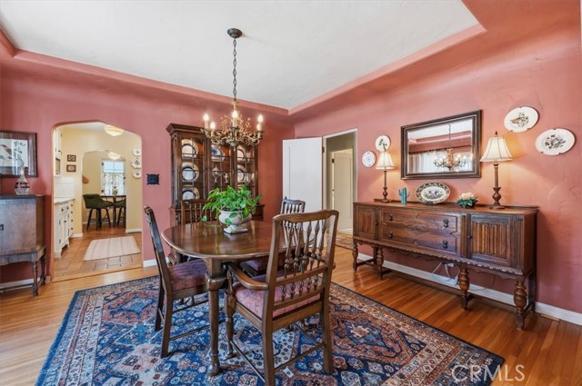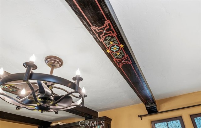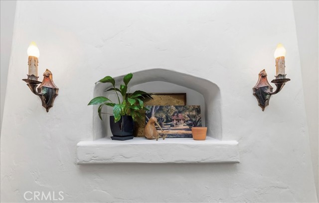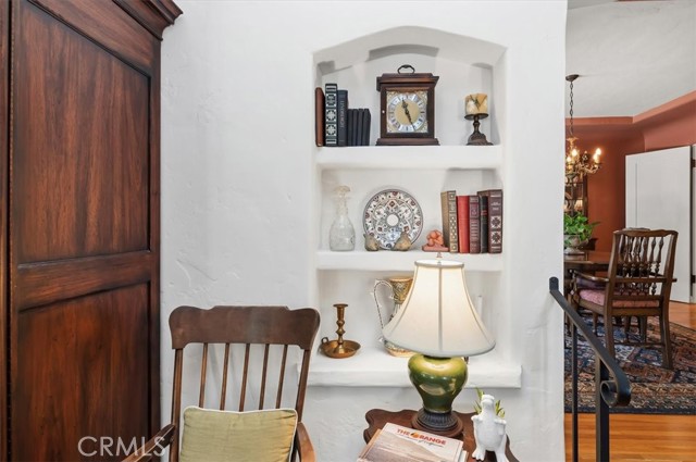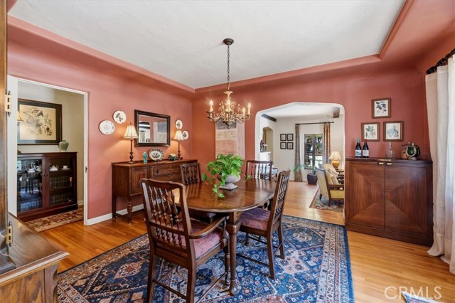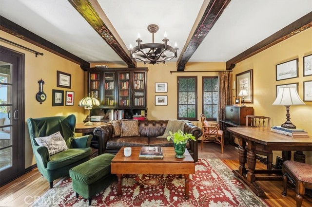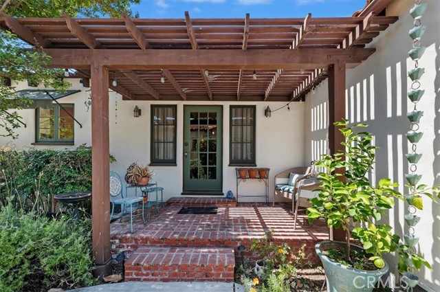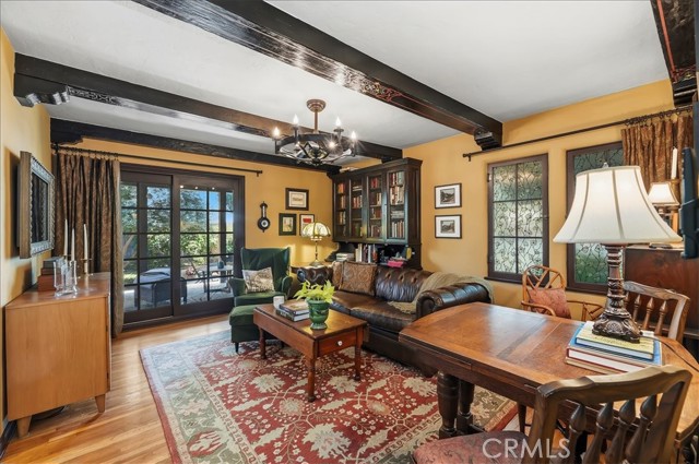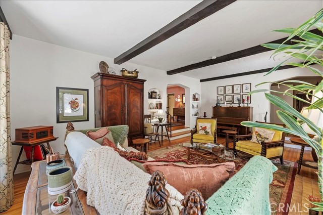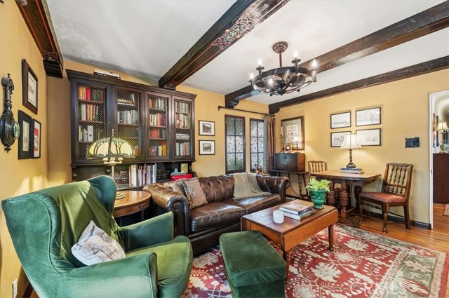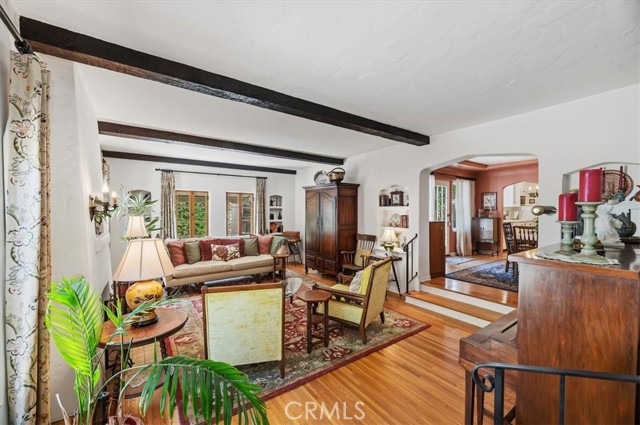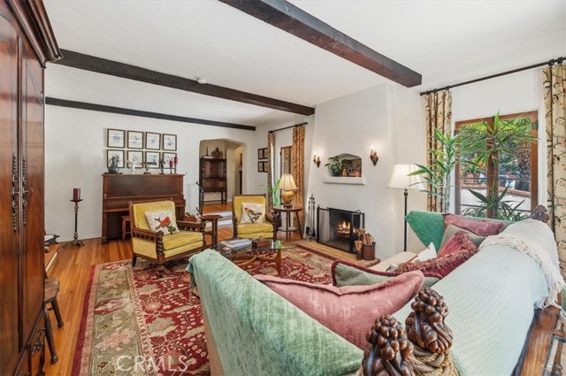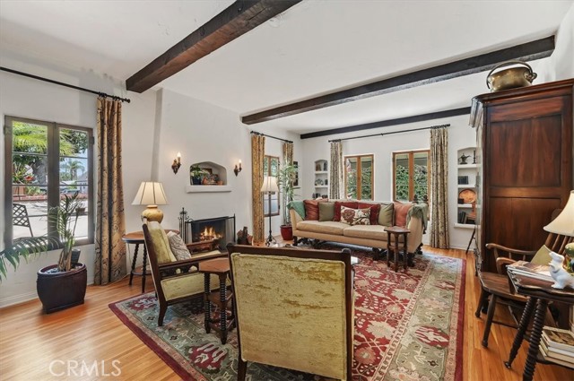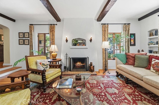 Inside, the home showcases beautifully preserved original details, including rich oak floors, a dramatic sunken living room with exposed beamed ceilings, and a stunning plaster fireplace with gas-burning logs and a charming niche mantel—creating a warm and inviting focal point. The formal dining room opens seamlessly to a side patio, perfect for effortless indoor-outdoor living and alfresco dining.