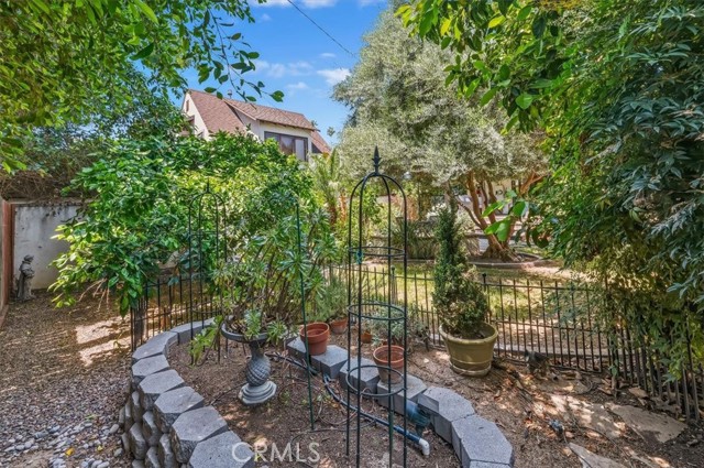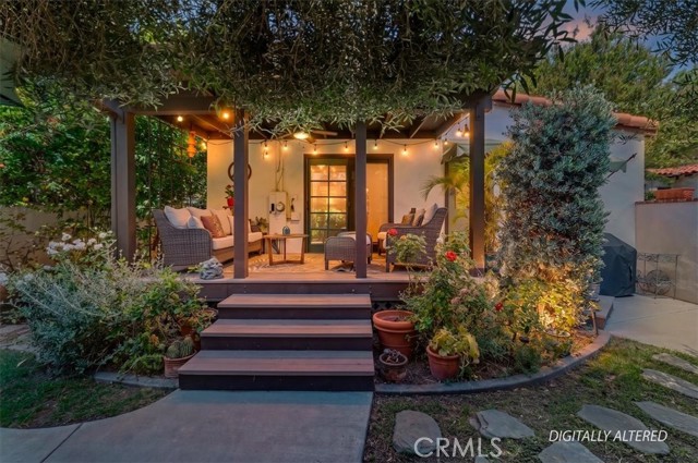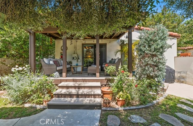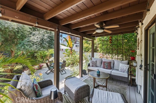 Step outside to a true garden retreat. A covered deck overlooks a tranquil koi pond with a cascading waterfall, surrounded by mature landscaping and a variety of fruit trees including grapefruit, orange, and avocado—creating a serene, private oasis.