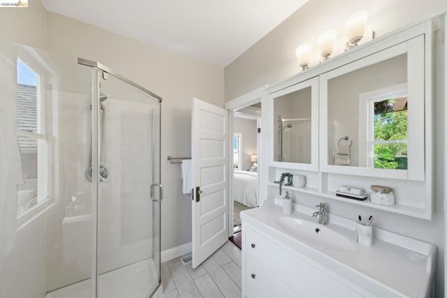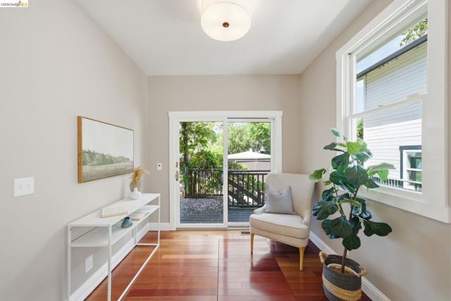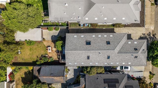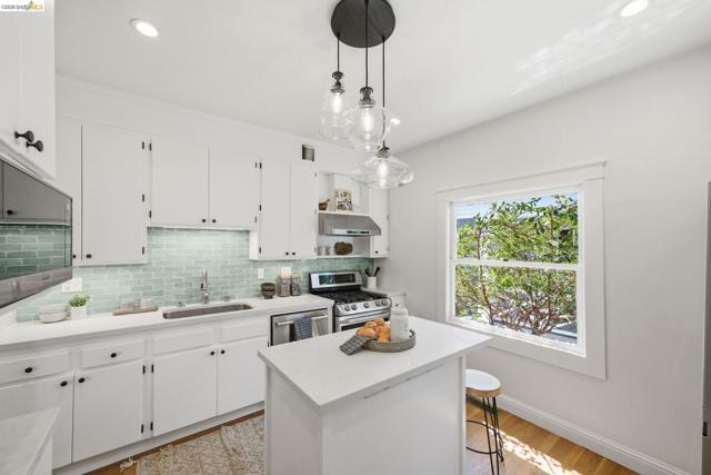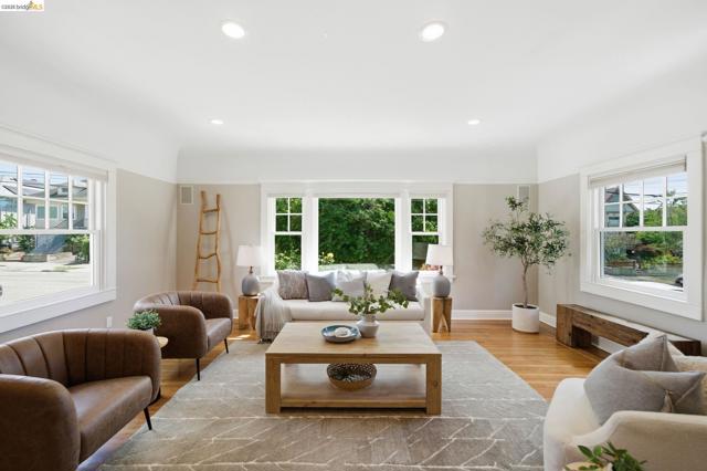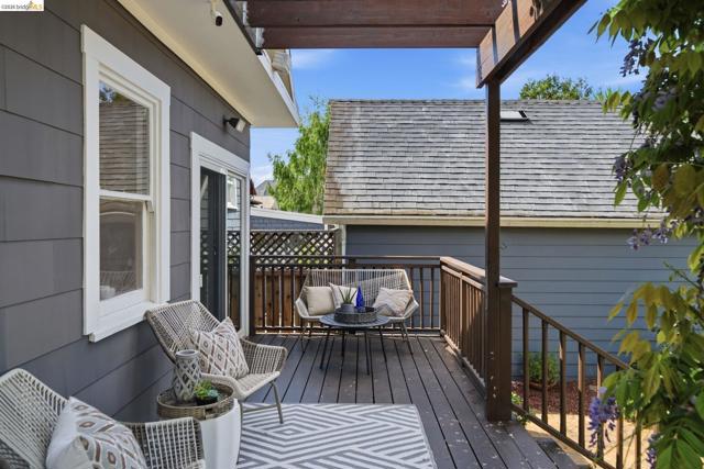 Built in 1910 and improved with intention, 1627 62nd Street is a four-bedroom, two-bathroom South Berkeley home that delivers more than its address suggests. A covered front porch and warm craftsman door set the tone. Inside, architectural columns frame a wide entry opening into a nearly 18x19-foot living room with honey-toned hardwood floors, recessed lighting, and a natural flow into the dining room and kitchen beyond. The kitchen features white cabinets with black hardware, white quartz countertops, a moss green subway tile backsplash, glass pendants over the peninsula, and a gas range — all updated in 2026. The main floor includes two bedrooms, a flexible office/fourth bedroom, two full bathrooms, and a laundry room with sliding glass doors to the back deck. Out back, a wisteria-draped pergola leads to a flagstone patio surrounded by established plantings. Upstairs, a primary suite with a dramatic vaulted ceiling, built-in storage, gable windows, and an adjacent skylit sitting room. A fully floored, skylit attic runs nearly 44 feet. Many systems improvements: full seismic retrofit, new sewer lateral, complete knob-and-tube decommissioning, high-efficiency furnace, and more than $180,000 in documented capital investment. HES = 4.