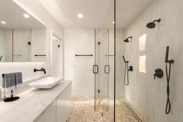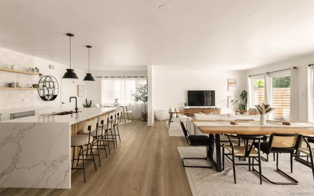 Welcome to 5173 Walsh Way — a fully reimagined contemporary residence in the coveted College View Estates. Thoughtfully curated by a San Diego-based interior design firm, this turnkey home has been elevated with intention across 2,093 square feet of impeccably designed living space. Wide-plank hardwood floors, crisp white walls, and designer finishes create an aesthetic that is at once refined and livable. The chef's kitchen stuns with a waterfall-edge quartz island, matte black fixtures, a professional-grade range, and handcrafted tile backsplash framed by floating oak shelves. The spa-like primary bath features a vessel sink, wall-mounted matte black hardware, and an oversized frameless glass shower with dual rain heads — every detail designed to feel like a five-star escape. The living room opens through a wall of sliding glass doors onto an expansive elevated deck with glass panel railings overlooking the San Diego Canyon — perfect for al fresco dining beneath café lights or watching the sunset over the canyon. Indoor/outdoor living has never felt so effortless. 4 beds | 2.5 baths | 2,093 sqft | 8,200 sq ft lot. Turnkey, no detail left untouched. Opportunities like this don't come twice.