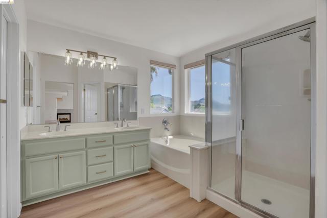 DIGITALLY STAGED. Back on market with fresh upgrades and thoughtful renovations. Welcome to Eagle Ridge, where sweeping hillside views create a serene backdrop for elevated living. Ideally located near Blue Rock Springs Golf Club, this beautifully maintained 4-bedroom, 3-bath home offers 2,799 sq ft of refined comfort and a spacious 3-car garage. A grand, light-filled foyer with a stunning staircase opens to soaring ceilings, formal living and dining rooms, and an inviting open-concept kitchen and family room with a cozy fireplace. The kitchen was fully renovated last month, featuring new stainless steel appliances and modern finishes, while new luxury vinyl plank flooring spans the entire downstairs and all bathrooms. A main-level bedroom and full bath provide flexibility for multi-generational living, guests, or a private office. Upstairs, the luxurious primary suite includes a gas fireplace, reading nook, walk-in closet, spa-like bath, and private balcony with breathtaking views. Fresh interior and exterior paint, an upgraded laundry room, and well-sized secondary bedrooms add comfort and versatility. The backyard offers low-maintenance landscaping, exotic fruit trees, and two charming gazebos—perfect for relaxing or entertaining. Truly an exceptional Eagle Ridge offering.