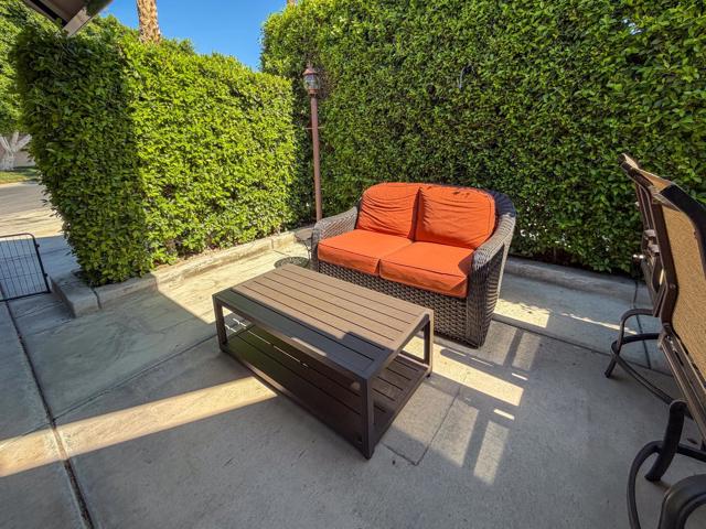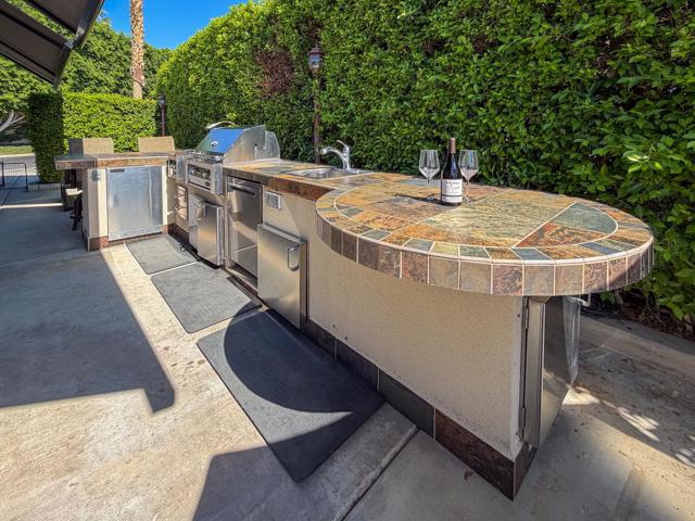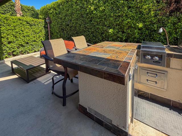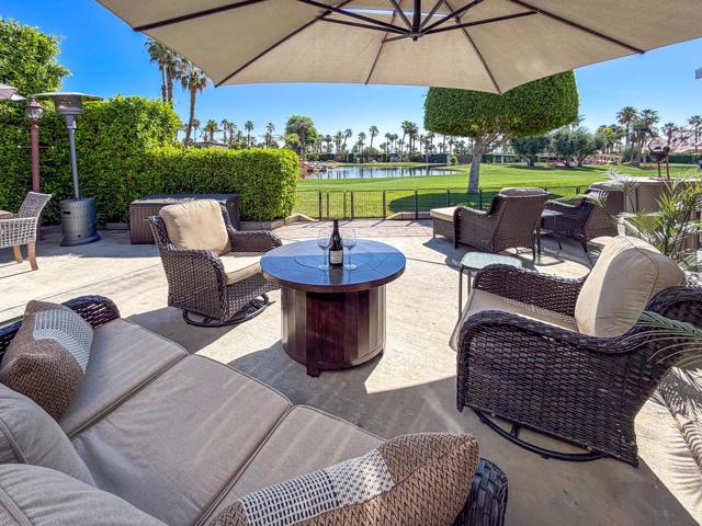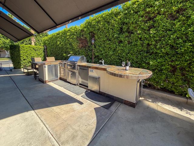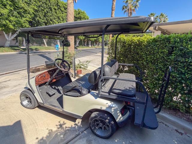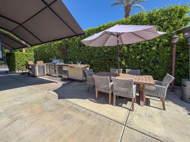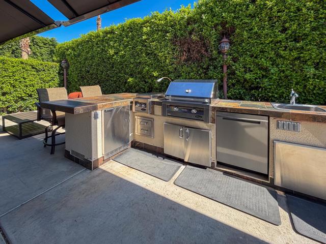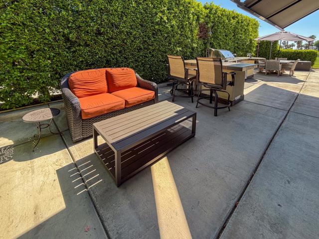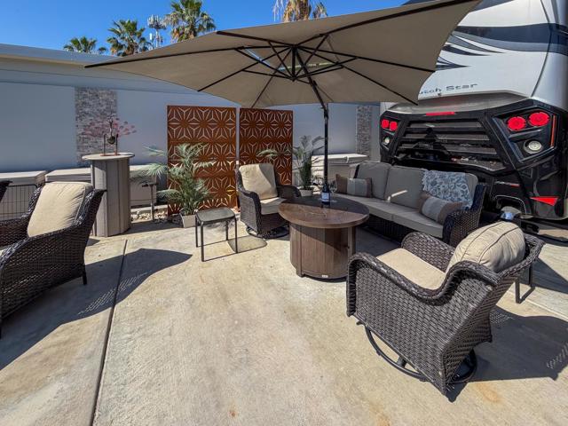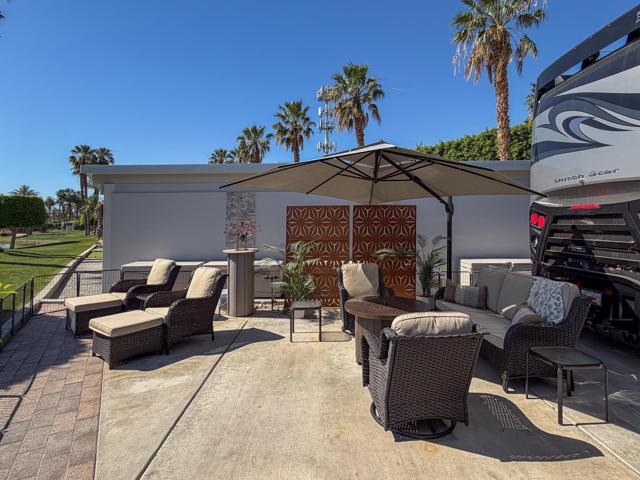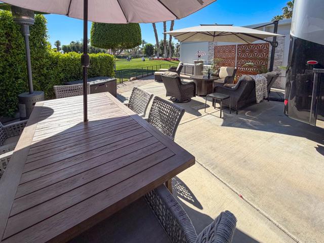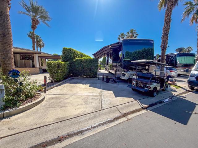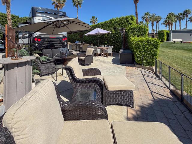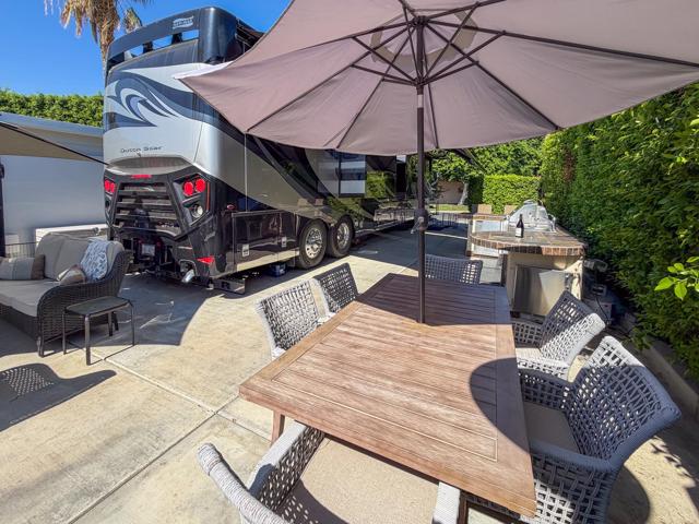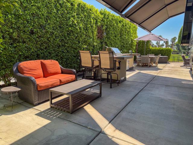 Welcome to Lot 331 at Outdoor Resort Indio, a beautifully positioned golf course lot offering expansive Phase Six fairway views with a stunning mountain backdrop and no tee box in sight. The rear of the lot faces east, providing comfortable morning sun and welcome afternoon shade from mature HOA-maintained trees. Framed by privacy hedges, this quiet location offers both scenery and seclusion while remaining conveniently near the resort's pet areas.Designed for entertaining and relaxed desert living, the large outdoor kitchen features hot water, dishwasher, mini fridge, BBQ, two-burner cooktop, and sleek stainless steel cabinetry and doors. The lot is being offered furnished and includes a fire table with three matching chairs, loveseat, ottoman, and end table, along with an outdoor dining table with umbrella and eight chairs. A cantilever umbrella, mushroom heater, and custom covers for all furniture enhance comfort and protection.Practical features include mid-lot hookups, three storage bins, hedge lighting stored in the storage box, and the dog fence that will remain. An included golf cart adds convenience for getting around this premier Class A motorcoach resort. Lot 331 combines location, functionality, privacy, and panoramic golf course and mountain views -- all within the sought-after community of Outdoor Resort Indio.Outdoor Resort Indio is a class A only motorcoach resort.