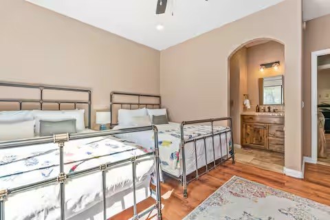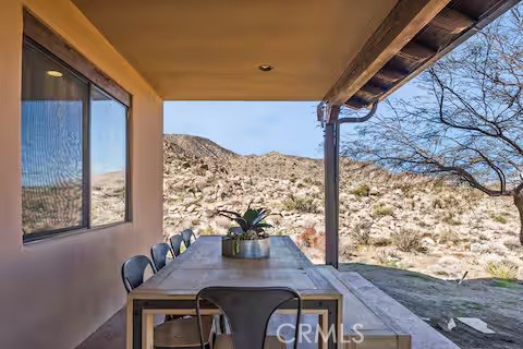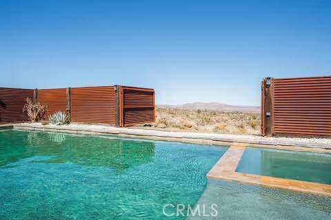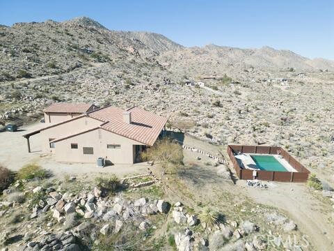 Escape to this gorgeous pool home on a generous 5 acre equestrian lot in Joshua Tree's most desirable neighborhood! Less than 3 miles from the National Park entrance, the location can't be beat. At almost 2600 square feet this spacious home enjoys sweeping views of the valley, high ceilings, and a touch of southwestern flair. Enter the home through the antique wooden door brought up from Mexico and you're greeted by custom wooden barn doors on either side of you leading to bonus rooms (originally den and dining rooms) now being used as additional bedrooms. Continue into the great room where you find a cozy family room complete with a pellet stove and reclaimed wood mantle. To your left is the dining area, and behind you the open kitchen. The kitchen features granite countertops, built in appliances, and tons of storage. Stand over your copper sink at the kitchen island and past your loved ones and onto the panoramic desert view through your sliding doors. On one side of the home you'll find a half bathroom as well as a primary bedroom en suite w/ a sliding door for more views, and a gorgeous en suite bathroom featuring a jetted spa tub, double vanity, walk-in shower, and walk-in closet. This entire suite is filled with natural light during the day and a peaceful distance from the other bedrooms at night. The other side of the home features two more bedrooms each with their own in-room vanity and a jack 'n' Jill bathroom. There is a laundry room that includes two sets of washer/dryers, cabinets, and a utility closet. The home features Central heat and air conditioning (2 units), central vacuum, ceiling fans in all rooms, and Nest thermostats.