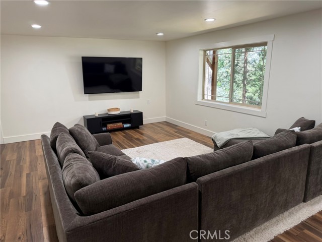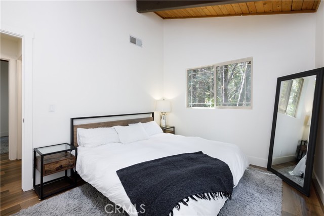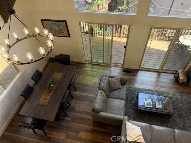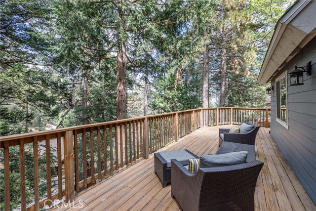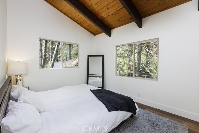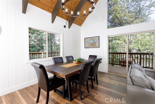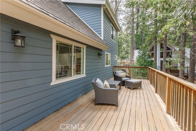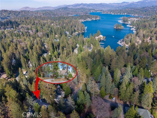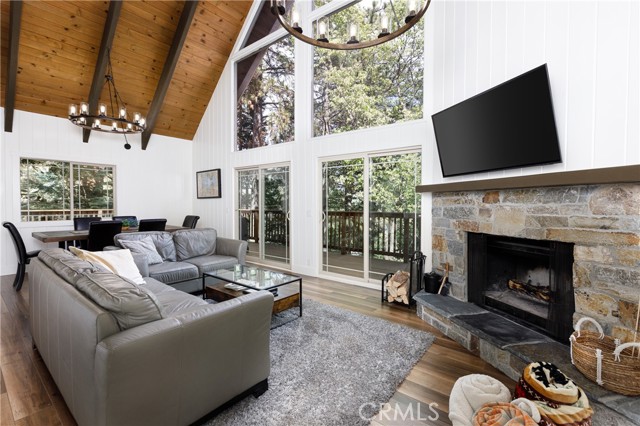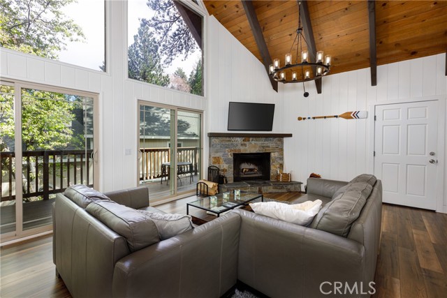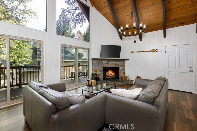 Beautifully remodeled Lake Arrowhead home with lake rights, blending modern design with warm mountain charm. Enjoy level street access and level entry into an extra-deep garage, ideal after a day at the lake. Inside, the dramatic living room features soaring wood-beamed ceilings and floor-to-ceiling windows, filling the space with natural light and framing serene tree views with a peek of the lake. The open layout flows to the dining area and updated galley kitchen, creating an inviting space for everyday living and entertaining. The fresh remodel showcases crisp white interiors, rich wood tones, and stylish lighting, offering a clean, elevated mountain aesthetic. Step outside to spacious composite decks, perfect for relaxing, dining, and enjoying the peaceful forest setting. Flexible floor plan includes main-level bedroom and bath, plus two upstairs bedrooms, full bath and a loft-style sitting area overlooking the living room. The finished lower level offers a large family room with access to a generous rear yard area. Major upgrades include Hardie cement siding (25-year color), 50-year roof, and dual-pane windows. Additional features: wood-burning fireplace with gas starter, direct garage access, underground utilities, additional driveway, covered front deck area and county-maintained/plowed road. Located just a short distance to the lake, shopping, and dining, this home is ideal as a full-time residence or weekend retreat. Furnishings may be available—turnkey opportunity.
