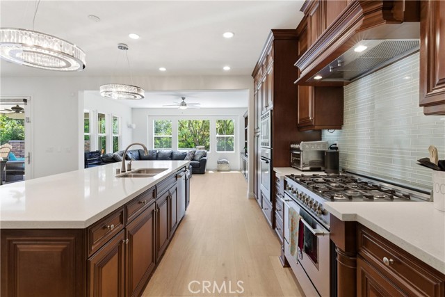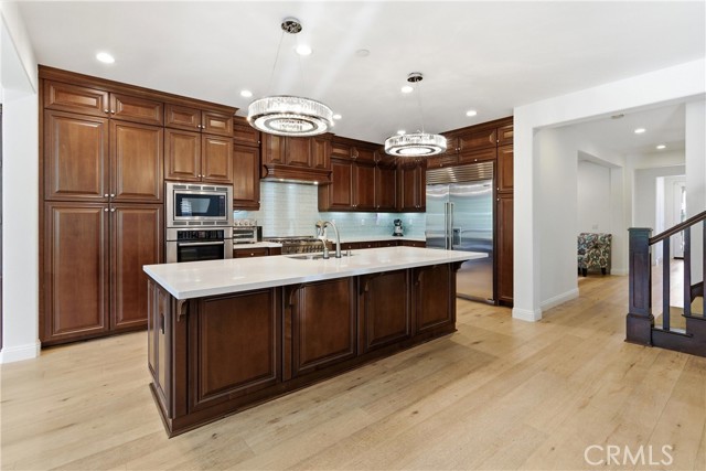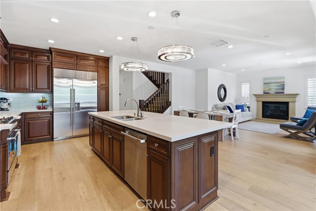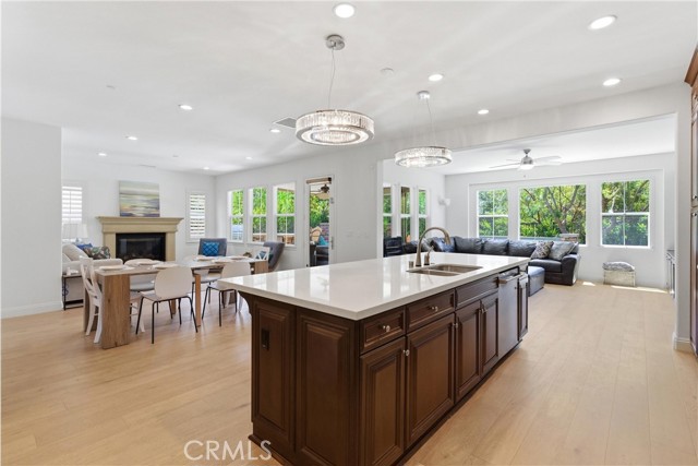 The upgraded kitchen features white quartz countertops, a stunning designer backsplash, and high-end appliances, designer crystal chandeliers. The office is enhanced with a custom-built bar and cabinetry, while the formal living room offers a grand fireplace, creating an elegant setting for entertaining.