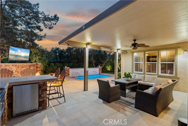 The backyard, completely reimagined in 2022, offers a private resort-style retreat with a heated pool and water feature, artificial turf, custom TV wall, fire pit, and a fully equipped outdoor kitchen with a Lynx grill and beverage refrigerator. The outdoor space is further complemented by enhanced landscaping, lighting, and a covered California Room with heaters, all overlooking the lush Wild Plant Garden.