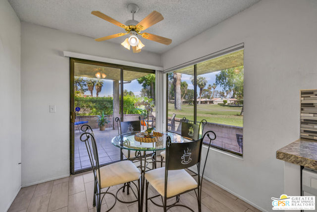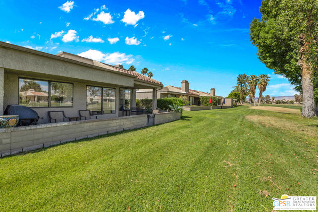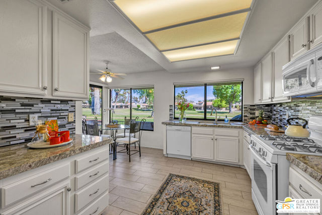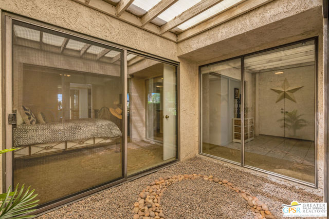 Discover the perfect desert retreat in the highly coveted Westgate enclave of Cathedral Canyon Country Club. Offered turnkey furnished, this sought-after 3 bed 2 bath single-level end unit is perched along the 18th fairway of the championship golf course, offering a front-row seat to emerald greens and stunning mountain views. The home opens with a formal entry that leads into a light-filled living room featuring soaring vaulted ceilings, a gas fireplace, and a cocktail station/wet bar. Designed for seamless entertaining, the living area flows directly to an expansive outdoor patio overlooking the fairway - an ideal setting for enjoying the iconic desert sunsets. The beautifully appointed kitchen boasts crisp white cabinetry, granite countertops, and a full appliance suite. Enjoy mountain views from the kitchen sink or the adjacent breakfast nook. For formal occasions, the dining room is anchored by a signature interior atrium, a unique architectural feature that bathes the center of the home in soft, natural light and provides a serene, private garden view from within. The Primary Suite: A spacious sanctuary with vaulted ceilings and a large walk-in closet. The ensuite bath features dual sinks, a walk-in shower, and a separate soaking tub, all opening to a private patio with serene mountain views. Two additional bedrooms offer comfort and flexibility. The second bedroom enjoys direct views of the atrium and convenient access to the guest bath. Prime location as an end unit with only one shared wall, this home offers a rare level of peace and privacy. You are perfectly situated for the best of the Coachella Valley, located just minutes from the Cathedral City Entertainment District, downtown Palm Springs, world-class restaurants, and Palm Springs International Airport. Outdoor enthusiasts will also appreciate the easy access to local hiking trails and the CV Link pathway. Cathedral Canyon Country Club offers the ultimate desert lifestyle with access to the championship 18-hole golf course, tennis courts, a clubhouse, and numerous pools and spas, all within a gated community. This home provides the perfect blend of a relaxed golf course lifestyle, incredible accessibility and is ready for your personal touches. Ideal for a full-time residence, weekend getaways or seasonal living!